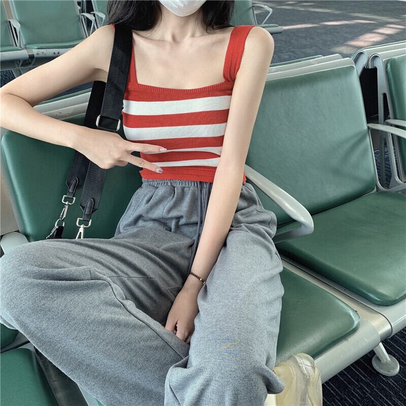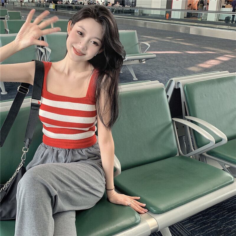 ニットショートノースリーブストライプスタンダードバックシャツ サマー レトロ 半袖 ハーフスリーブ 夏物 ガールズファッション56074949483