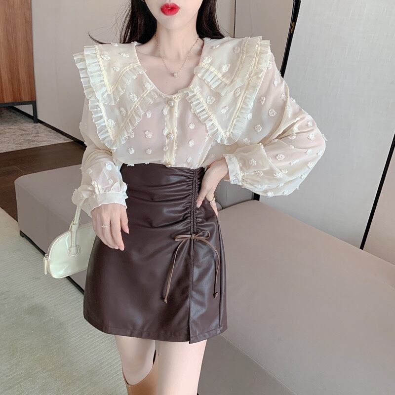 スタンダードレースシフォンシャツ ハイウェストギャザープリーツAラインレザースカート オータム ロング レトロ ストリート 秋物 ガールズファッション88086489644