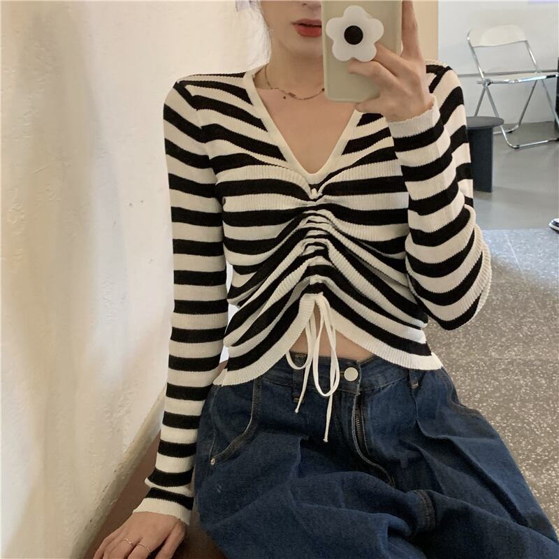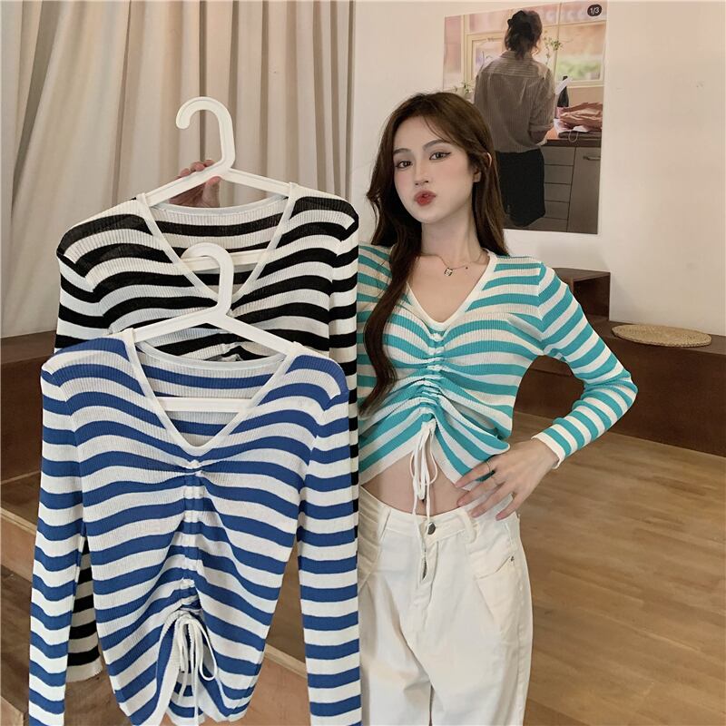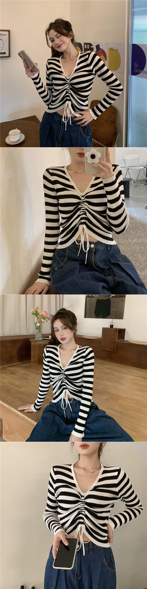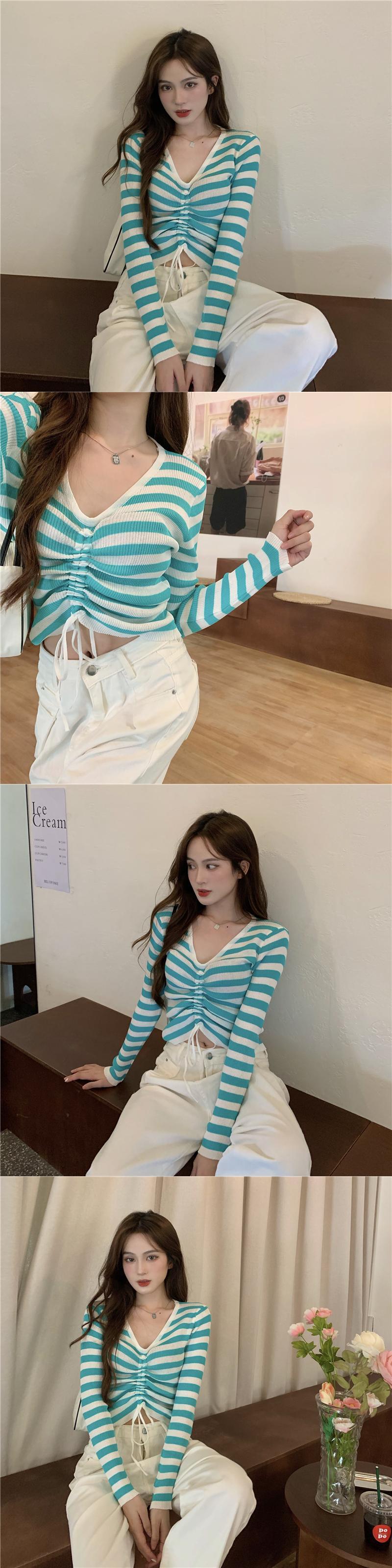 Vネックギャザーストライプセーター レディースオータムカジュアルシャツ ロング 秋物 ガールズファッション57644224726