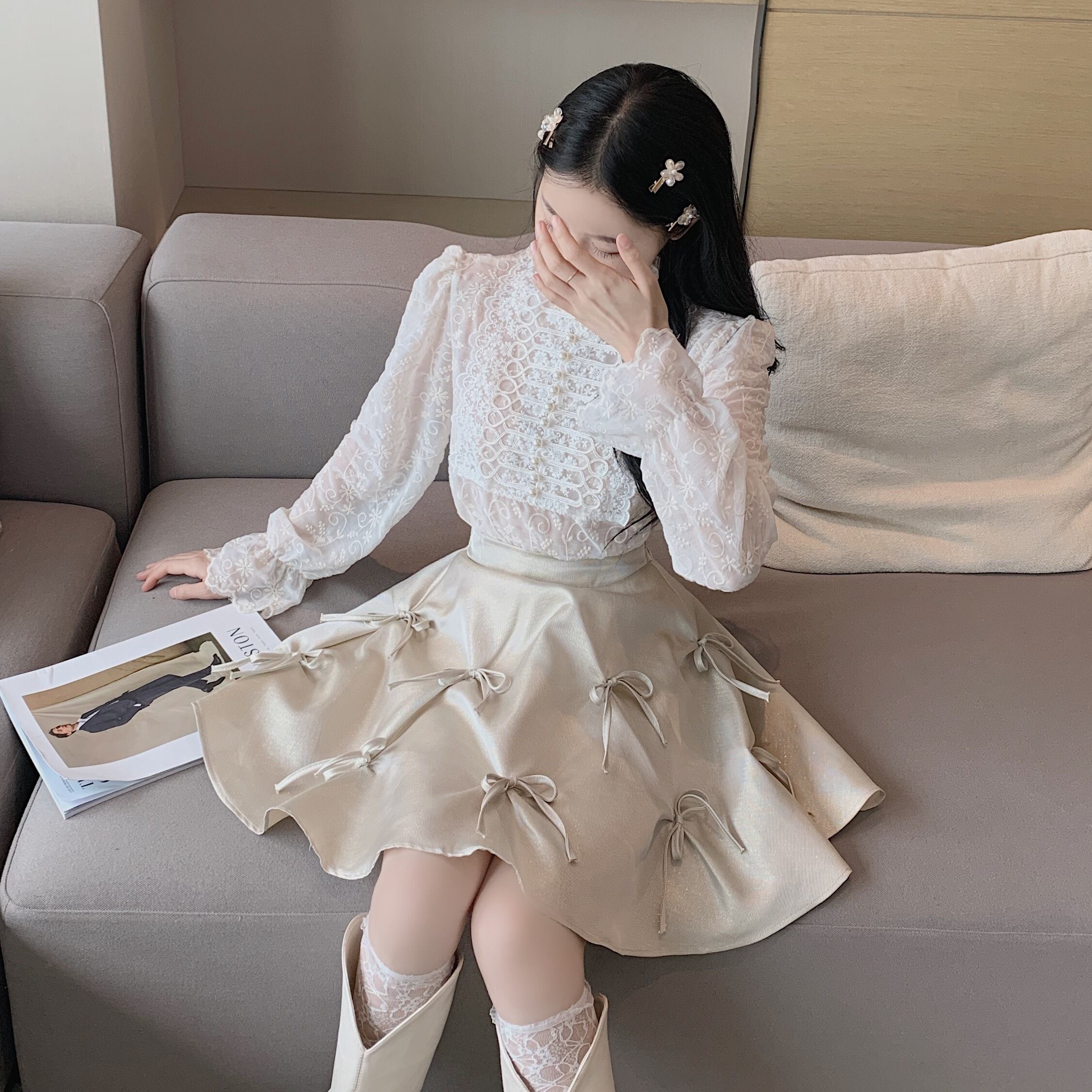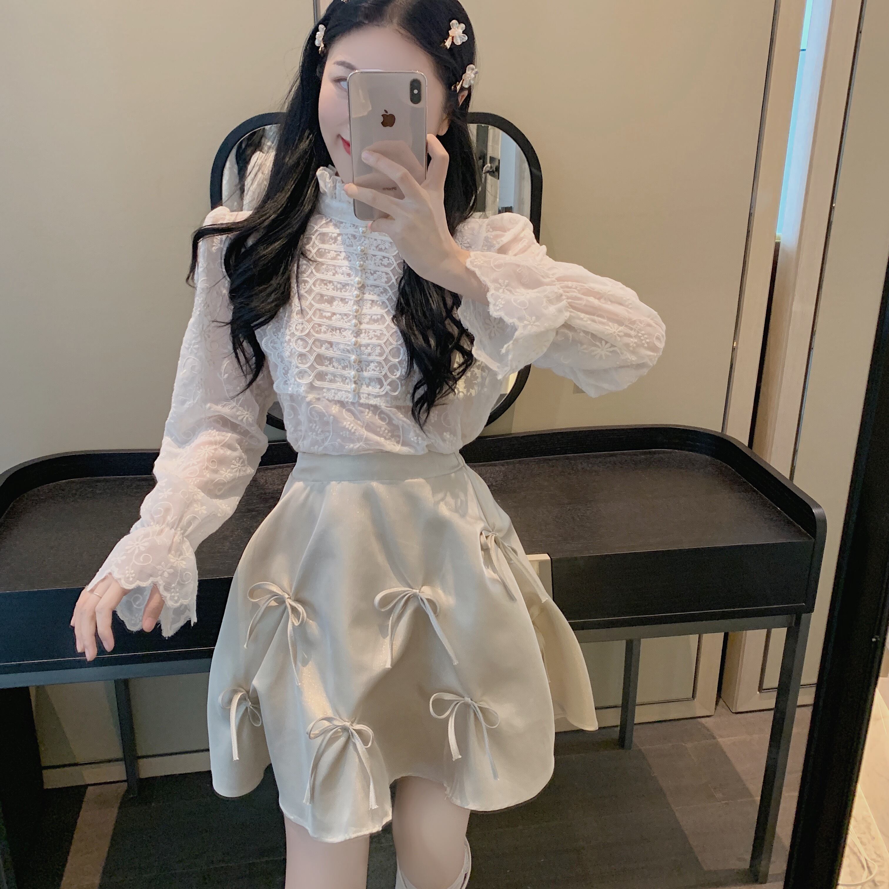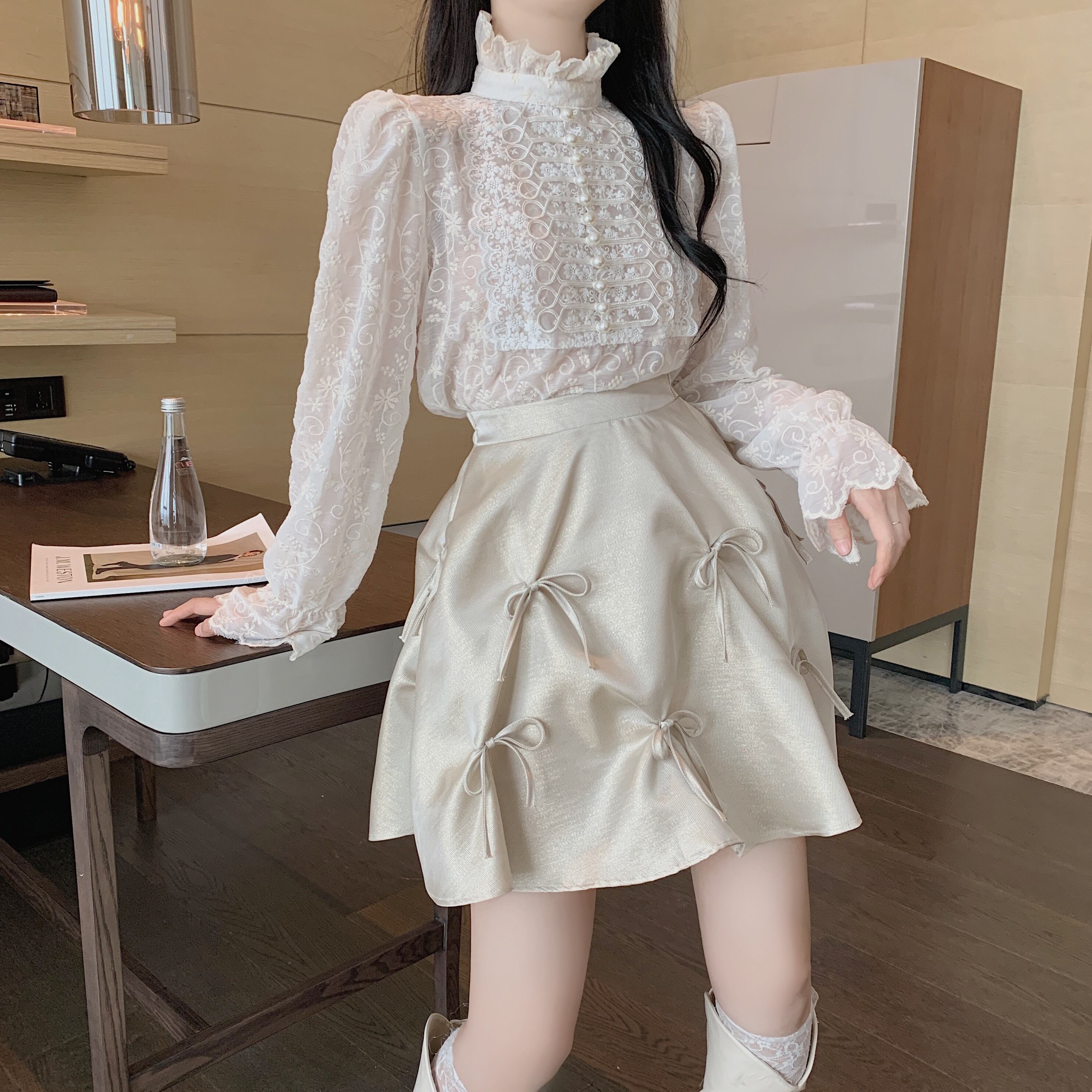 色:アプリコットレーストップ,アプリコットスカート,黒スカート