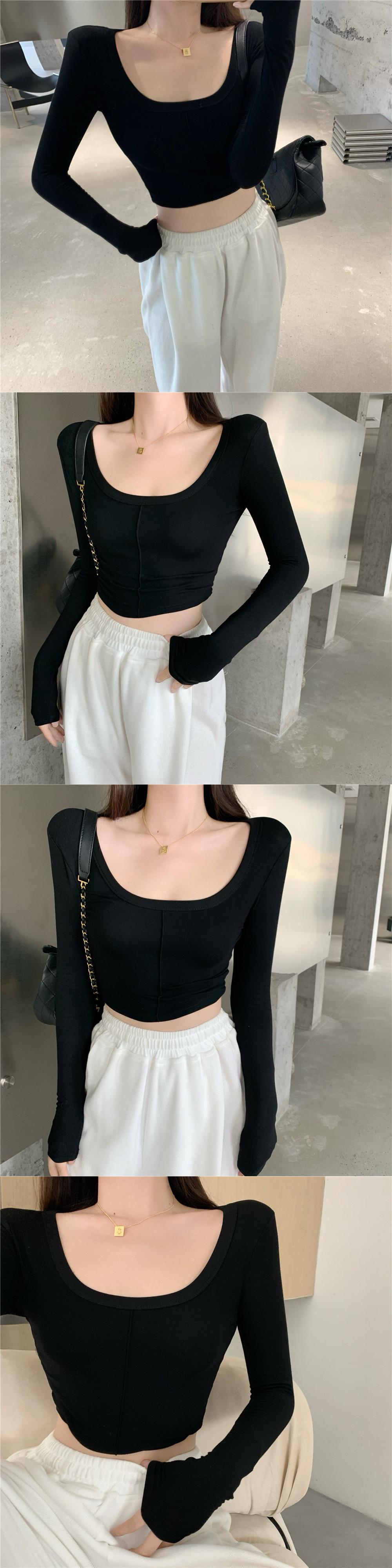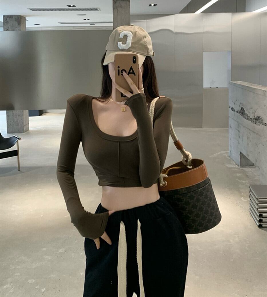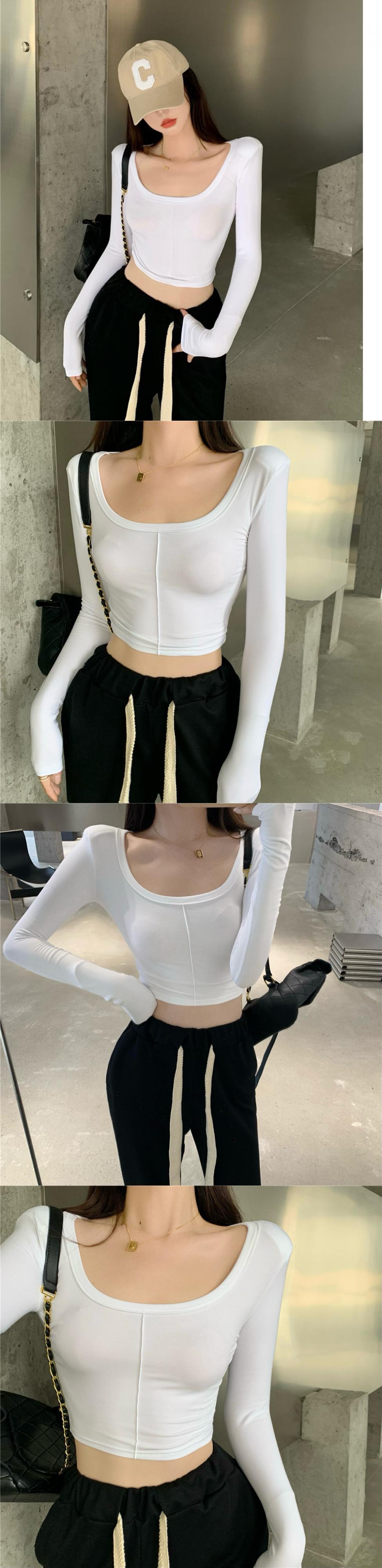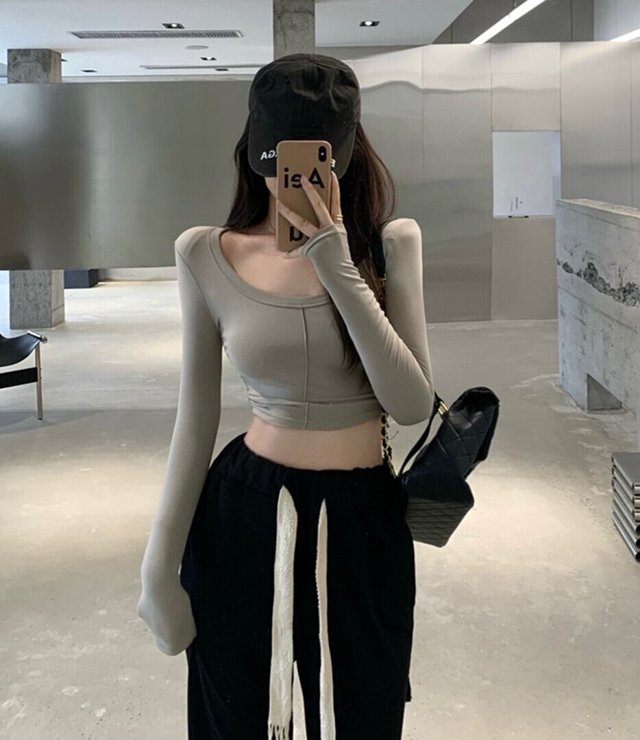 ハイウェストウェストクロップドショートTシャツ シャツ オータムストレッチソリッド カラートップス ロング エラスティック 伸縮 秋物 ソリッドカラー ガールズファッション96122640093