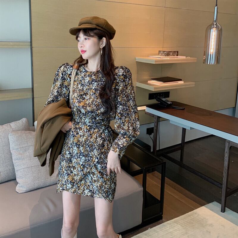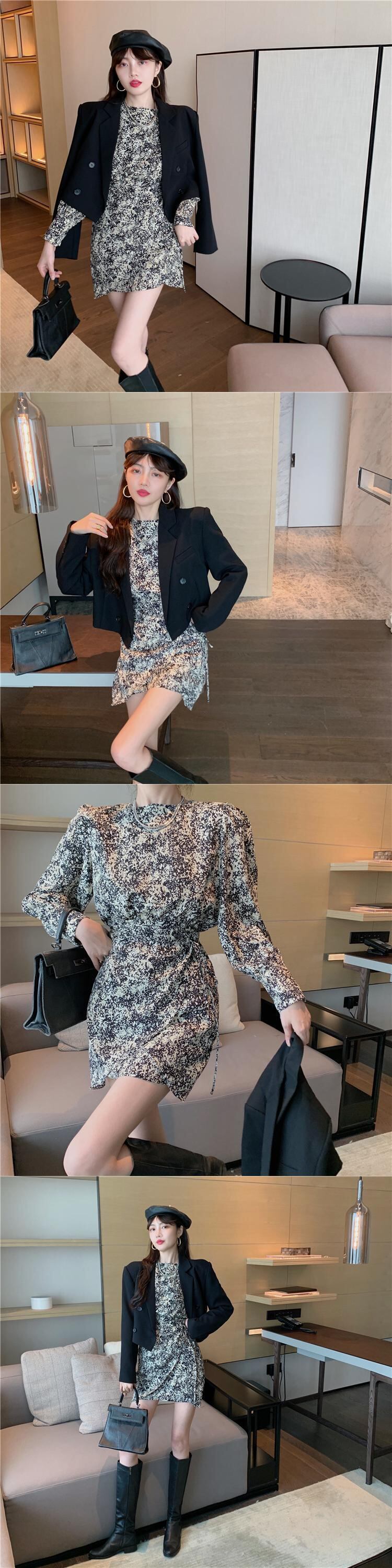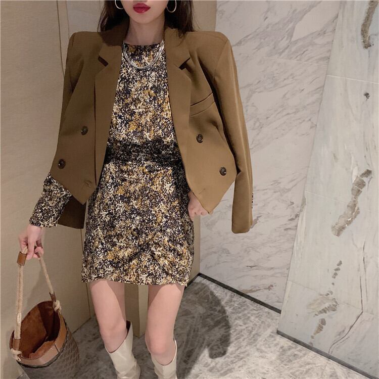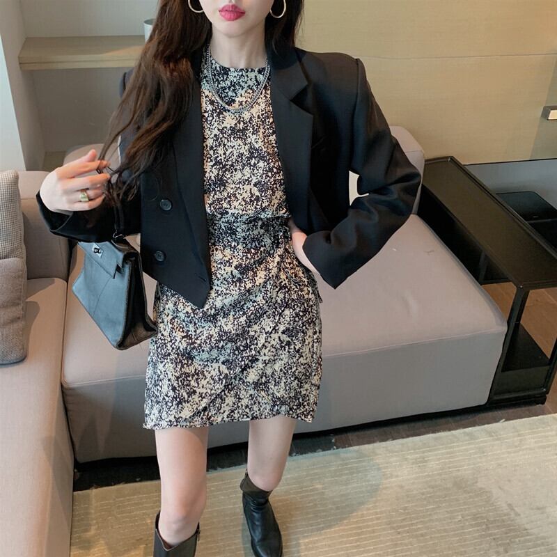 オータムウェストフローラルドレス スタンダードショートジャケット ロング レトロ ストリート 秋物 花柄 ガールズファッション85369220105