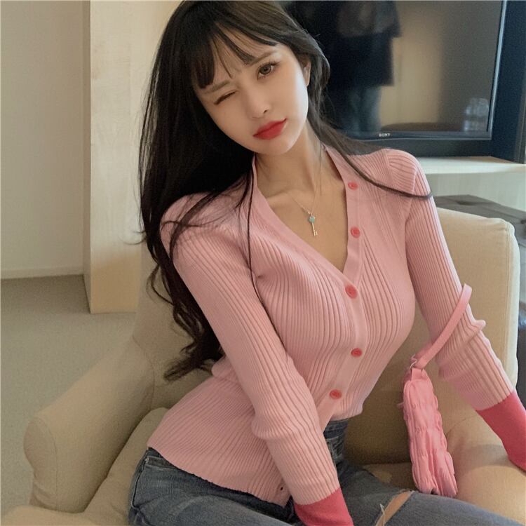カラーセーター オータムVネックスリムシャツ トップス ロング 秋物 ガールズファッション2338111458