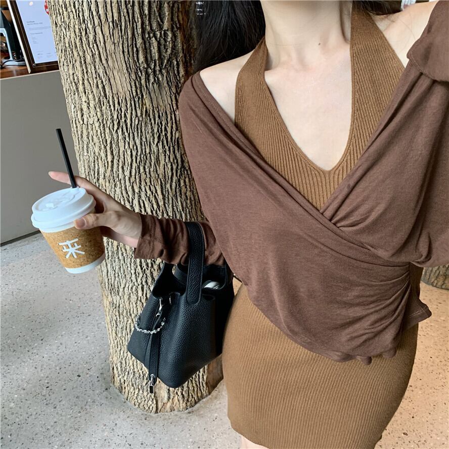 クロスVネック薄手トップス オータムニットドレス ロング 秋物 ガールズファッション225410016