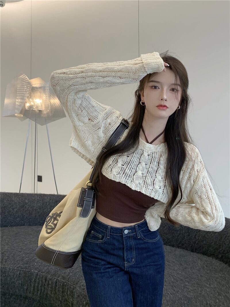 ニットセーター オータムレッド薄手ブラウス ルーズショートトップス ロング 秋物 ガールズファッション86731345679