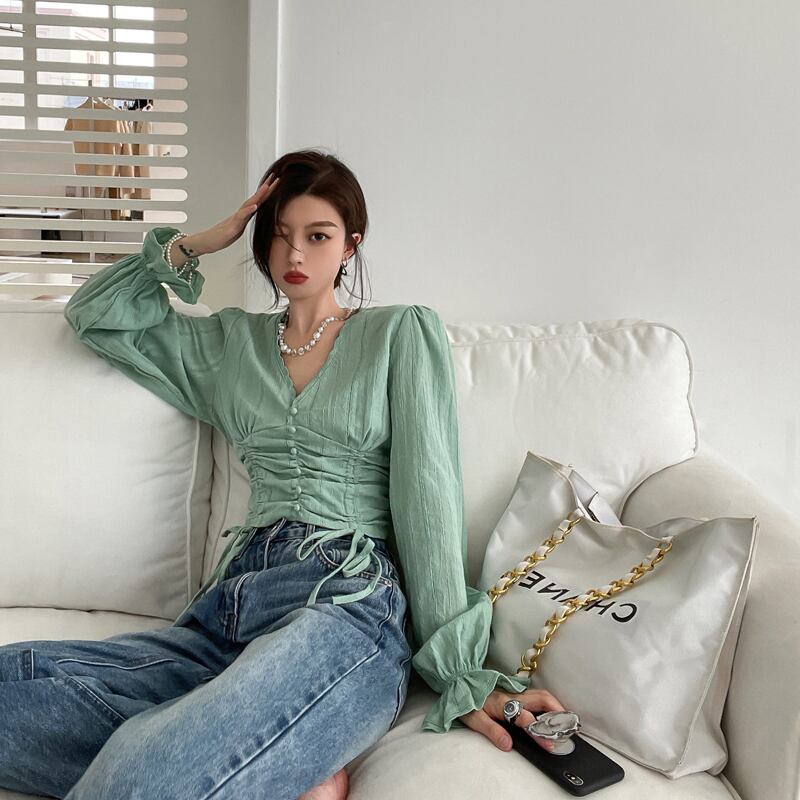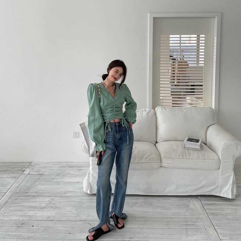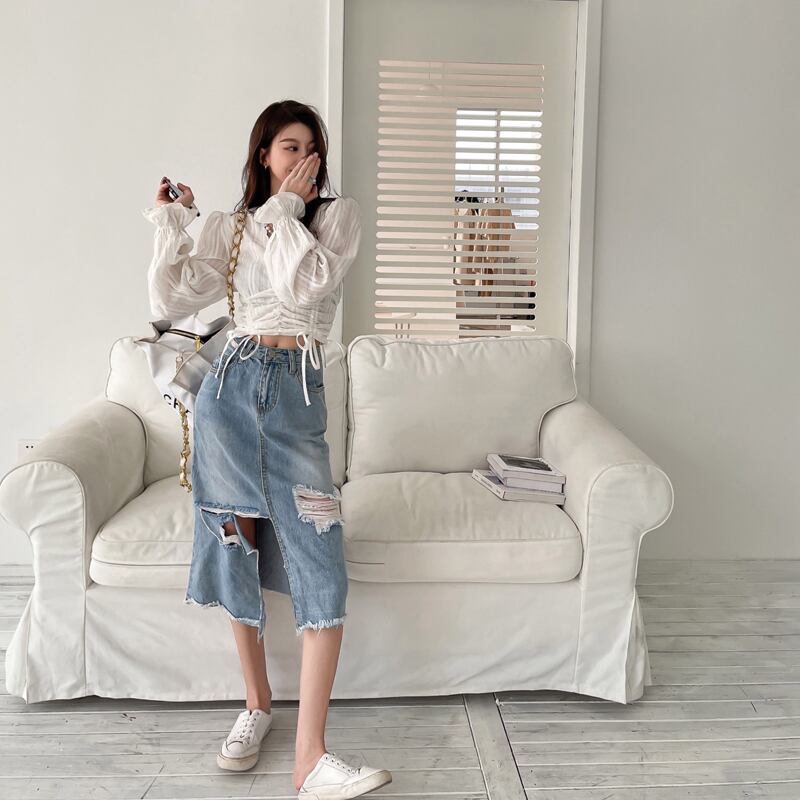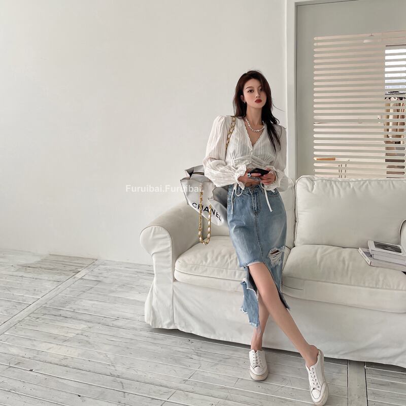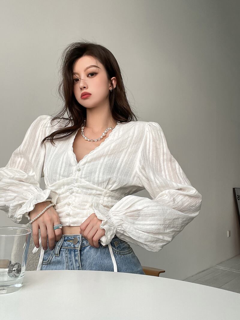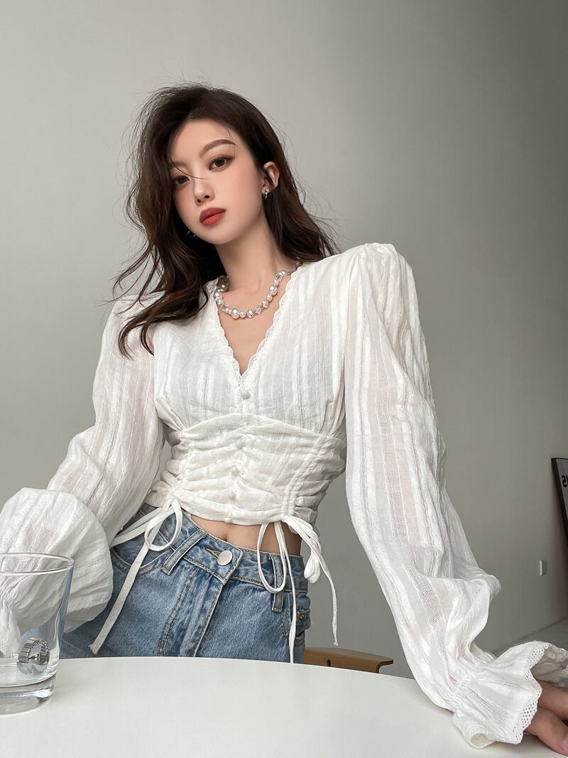 ホワイトレースシャツ オータムショートトップス スタイルVネック ロング 秋物 ガールズファッション92192007449