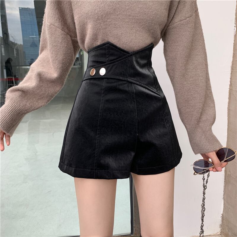 ブラックカジュアルショーツ オータムハイウェストウェストバックルルーズレザーパンツ 薄手Aライン 秋物 ブルマー ガールズファッション45044111195
