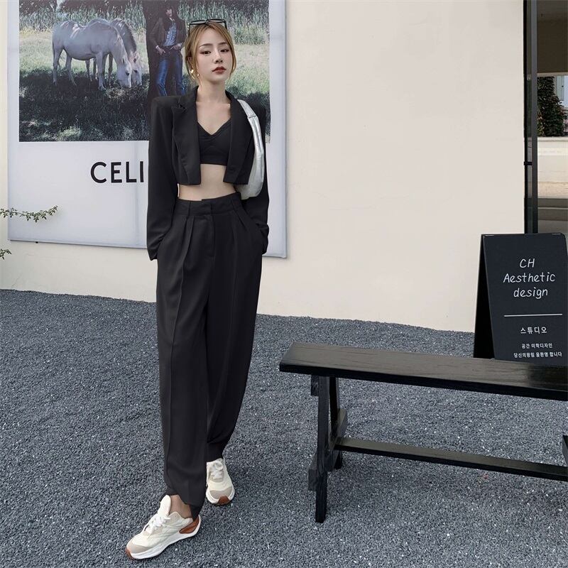 色:オフホワイトのスーツ,黒いスーツ,ベージュパンツ,黒いズボン