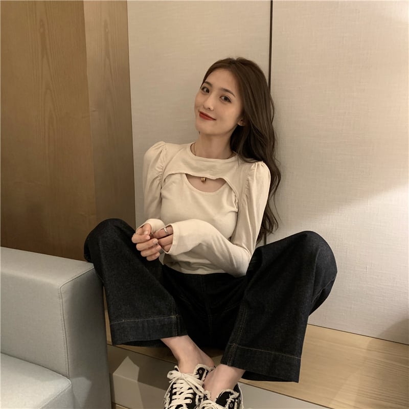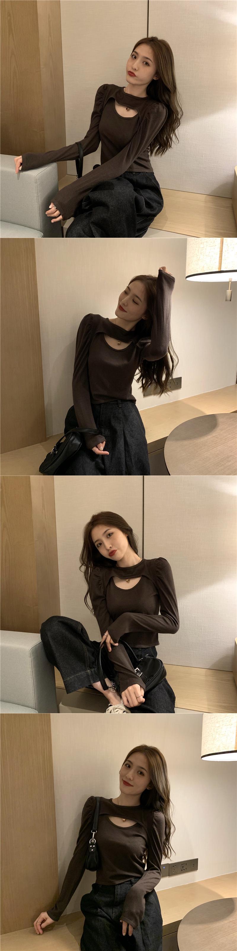 オータム薄手ラウンドネックスリーブセーター ショートTシャツ トップス ロング 秋物 Oネック ガールズファッション73134455081