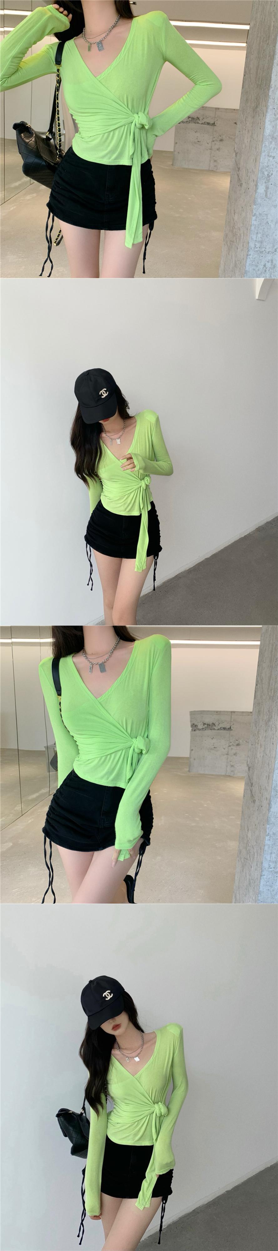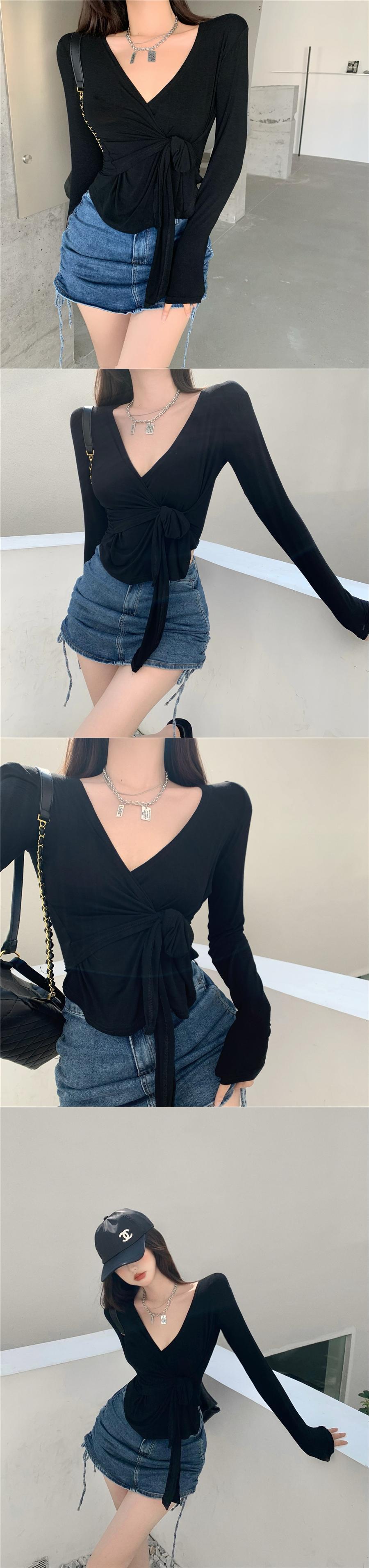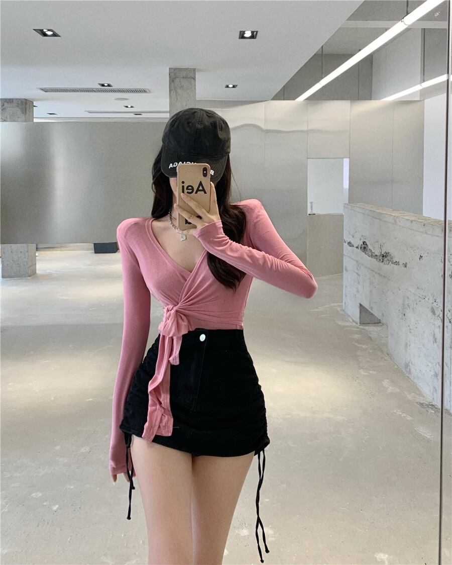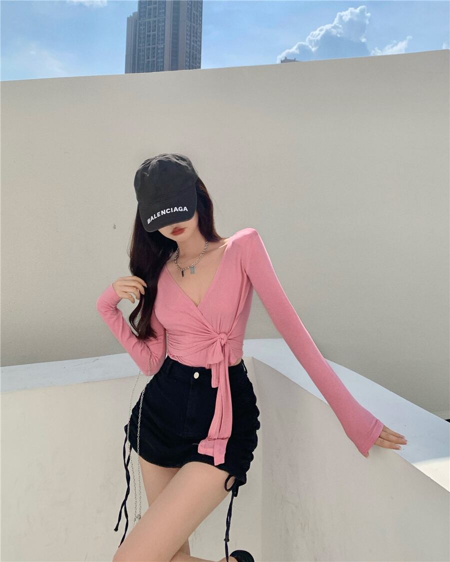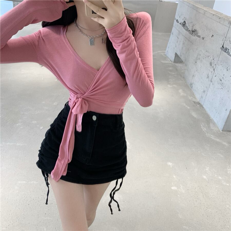 薄手Vネックシャツ ウェストショートトップス レッドソリッド カラー長袖スリーブTシャツ ロング ソリッドカラー ガールズファッション55271661584