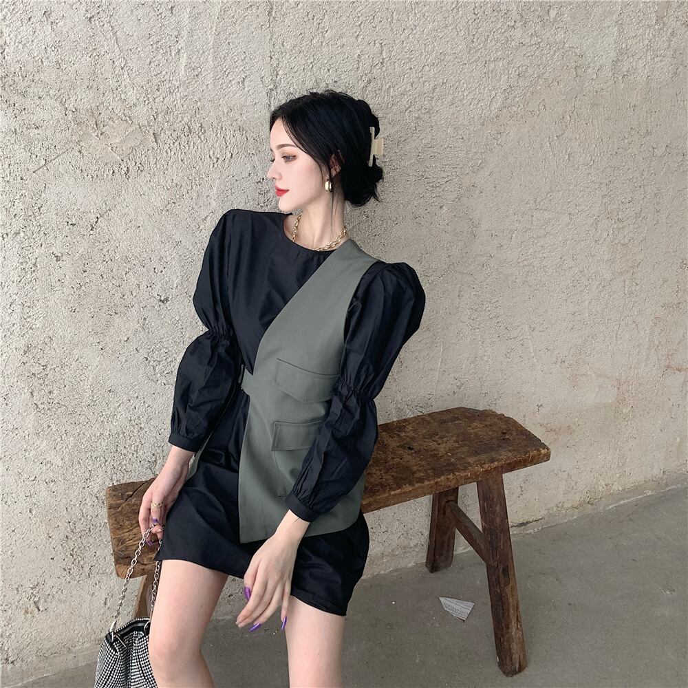 色:白のシャツ,黒いシャツ,黒のベスト,アーミーグリーンベスト