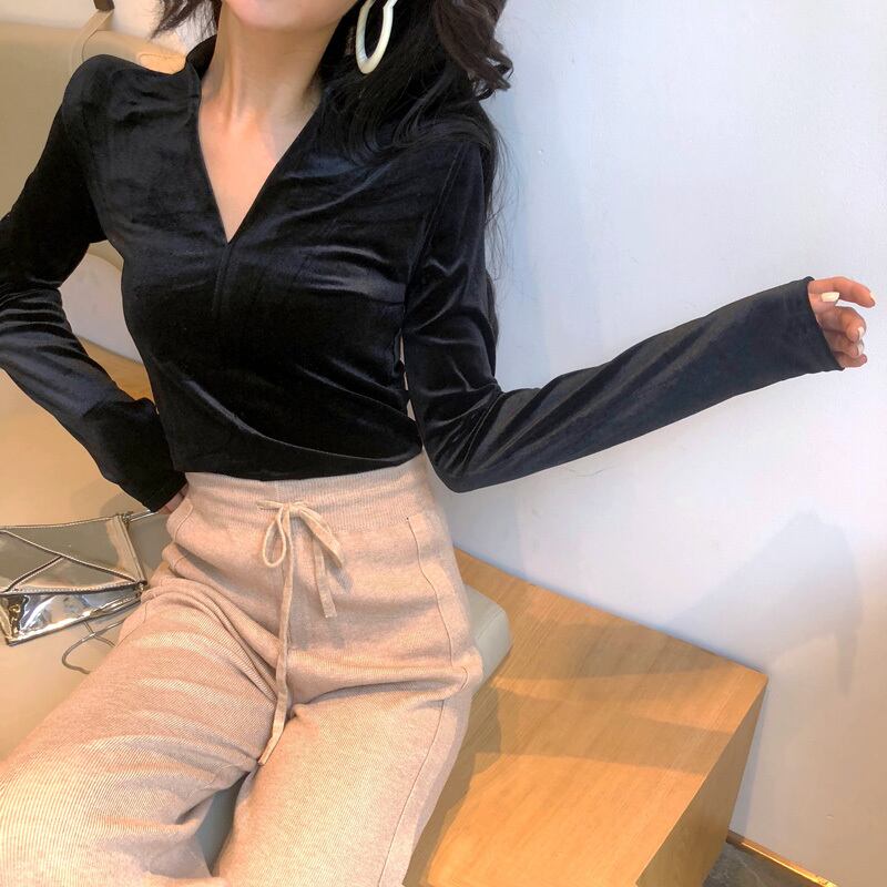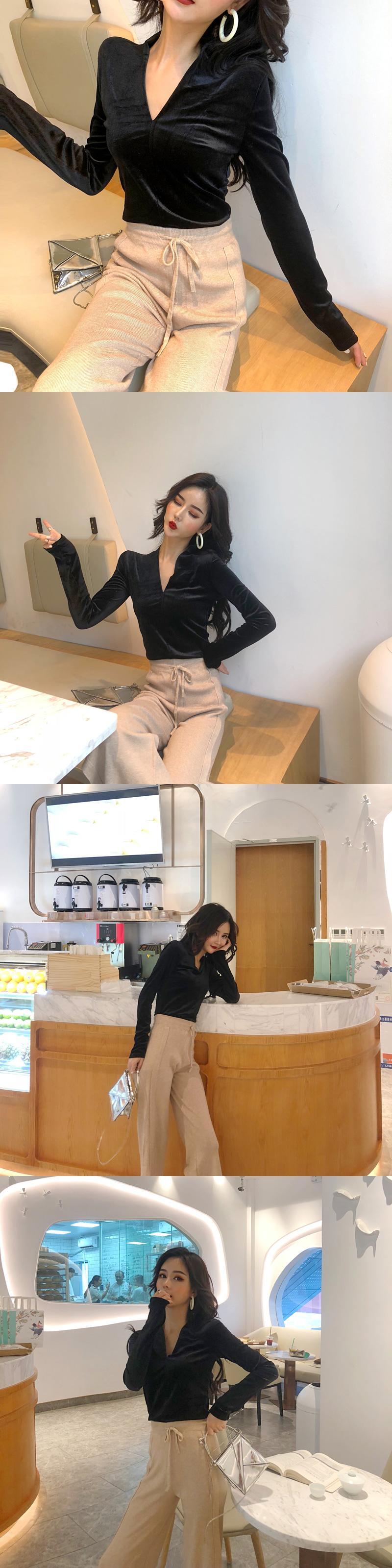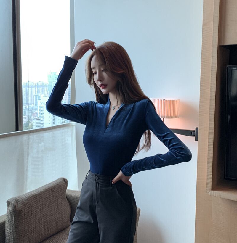 スタンダードVネックスリムオータム薄手シャツ ロング レトロ ブラウス 秋物 ガールズファッション16651301671