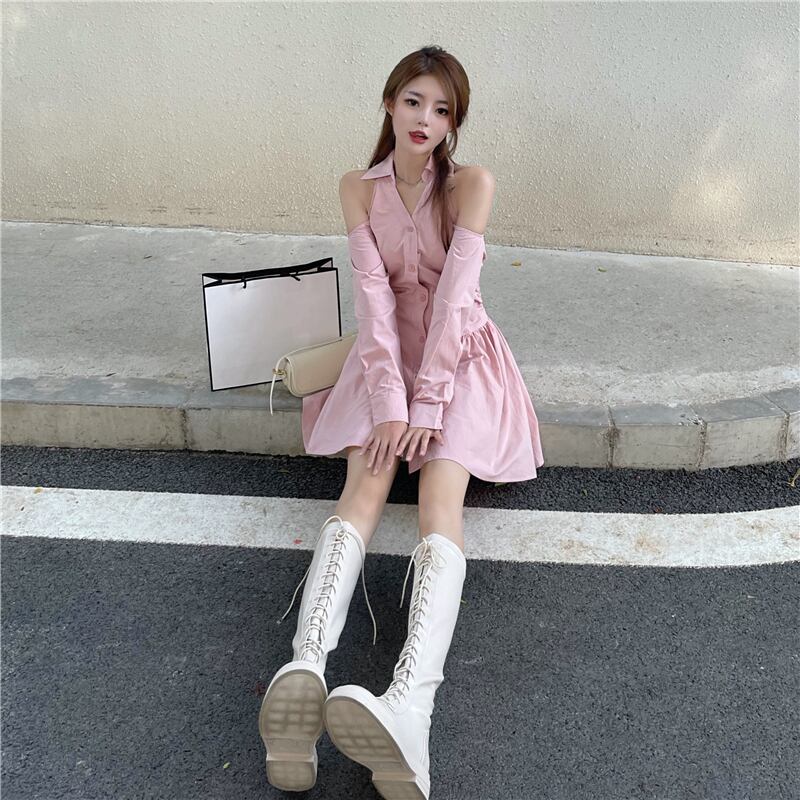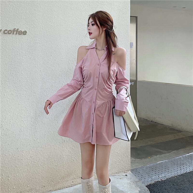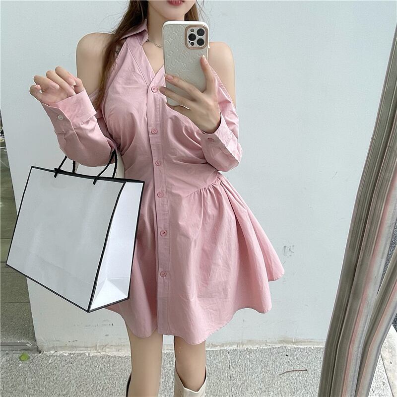 シャツ ドレス オータムウェスト薄手Aラインスカート ロング ピンク 大人ガーリー スウィート キュート カジュアル 秋物 オフショルダー ガールズファッション13643443966