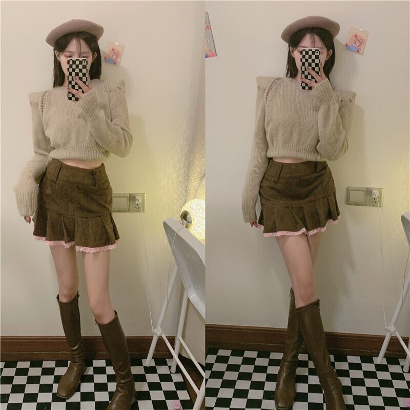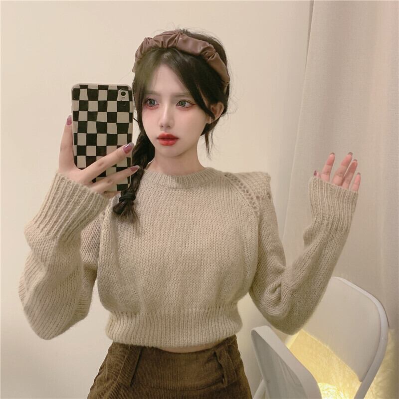 ラウンドネックショートニットセーター Oネック ガールズファッション91433633866