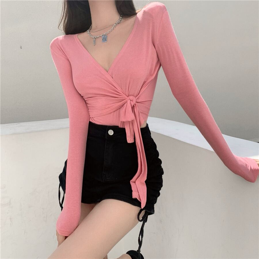 Vネック薄手ウェストショートTシャツ スリムトップス ロング ガールズファッション30953930134