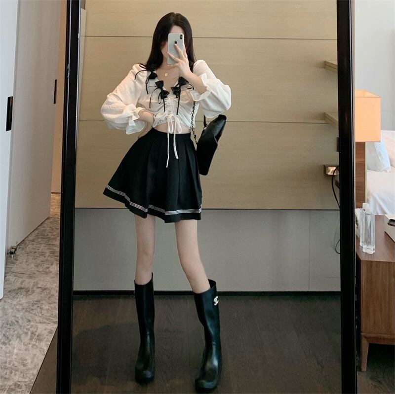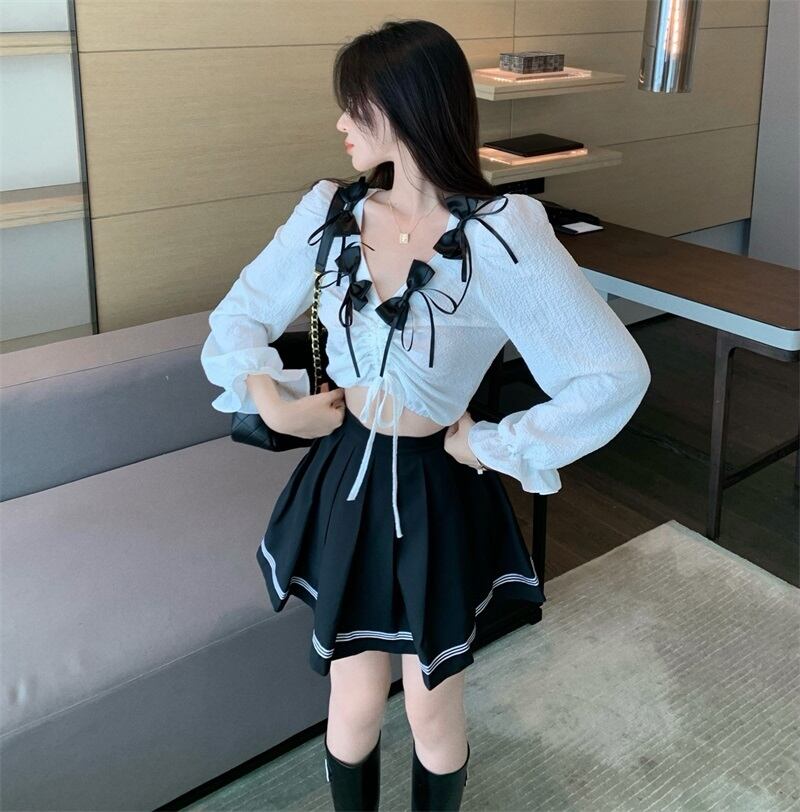 Vネックカラーギャザーショートシャツ ハイウェストウェストスリムプリーツスカート オータム リボン ストリート 秋物 ガールズファッション82598719105