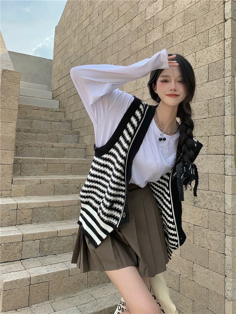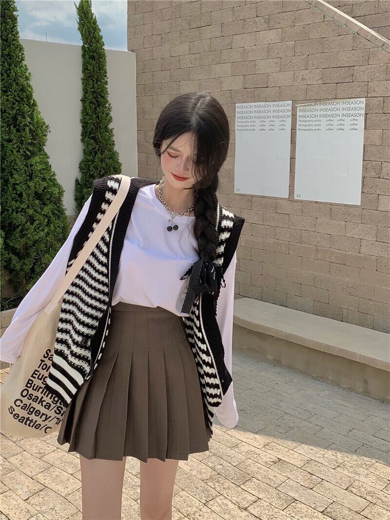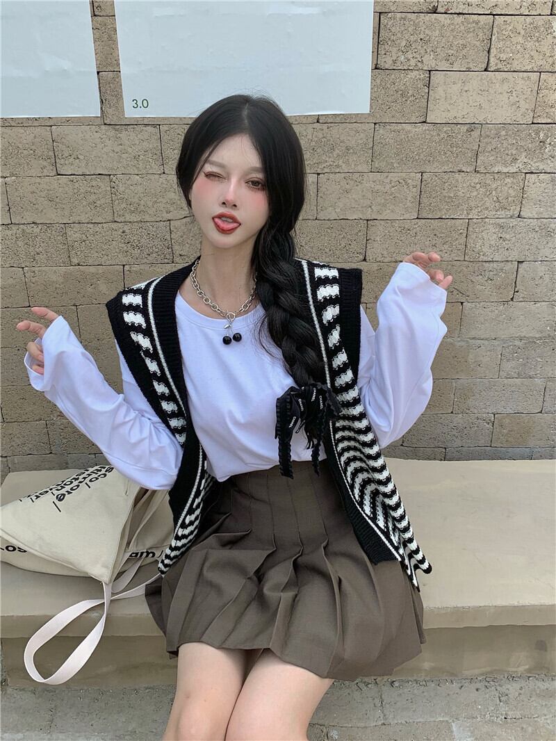 スタンダードノースリーブニットオータムスタイルホワイトシャツ プリーツスカート レトロ 秋物 ガールズファッション94460825326