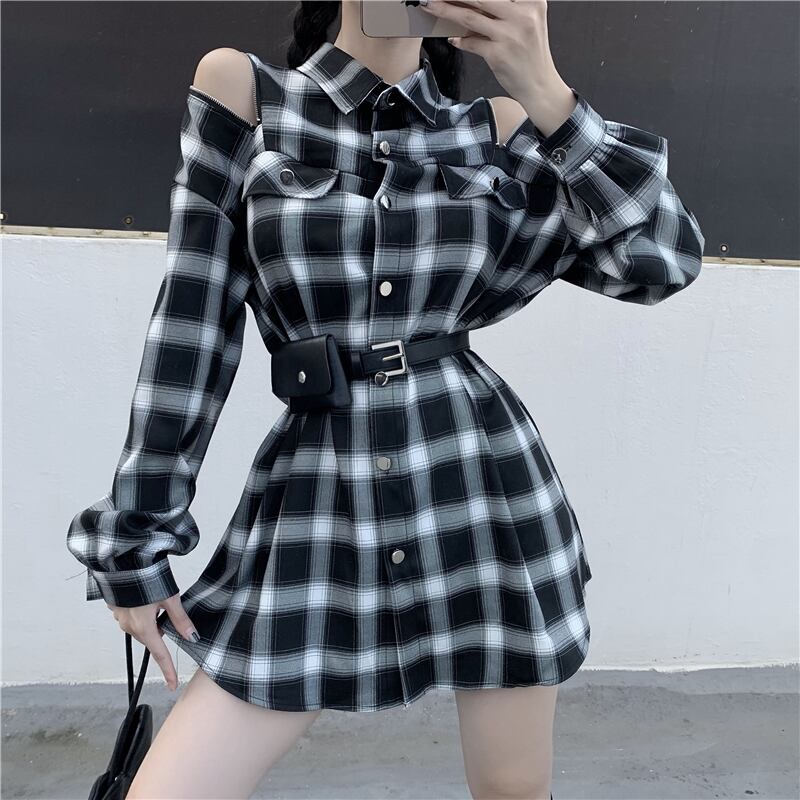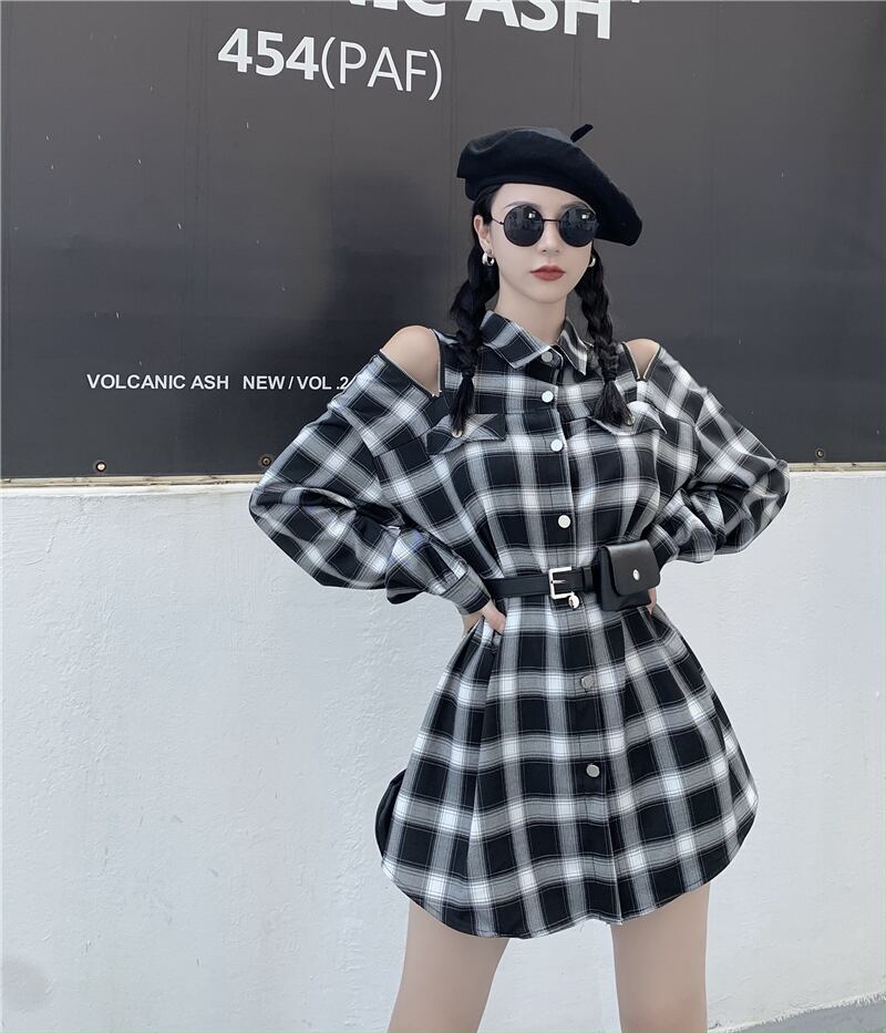 スタンダード格子柄シャツ ドレス オータムスタイルスカート ロング レトロ ストリート 秋物 オフショルダー ガールズファッション27443860552