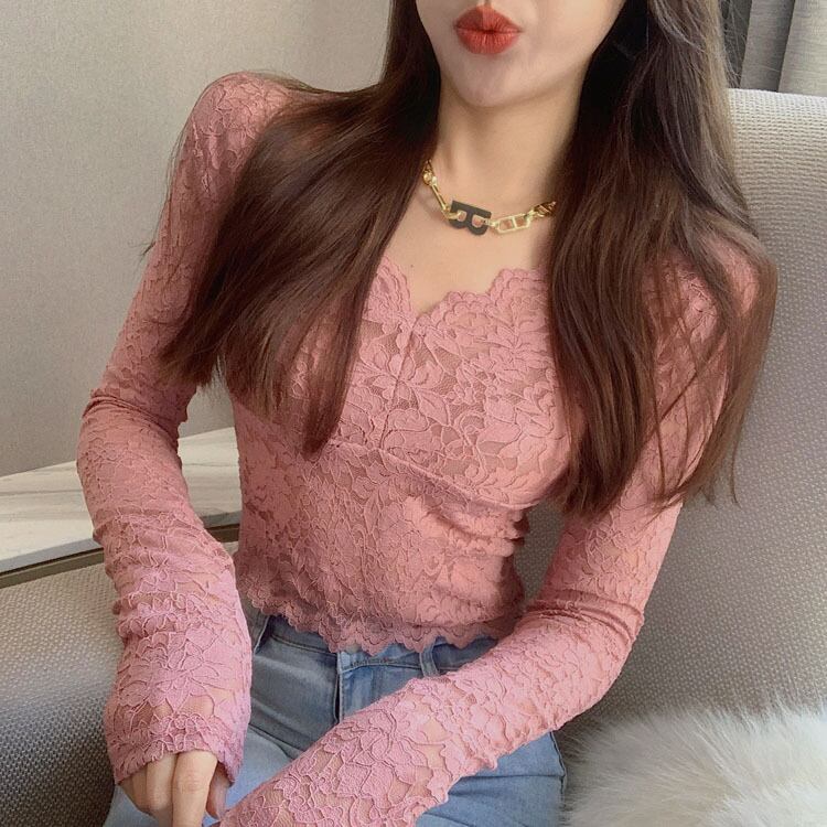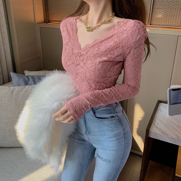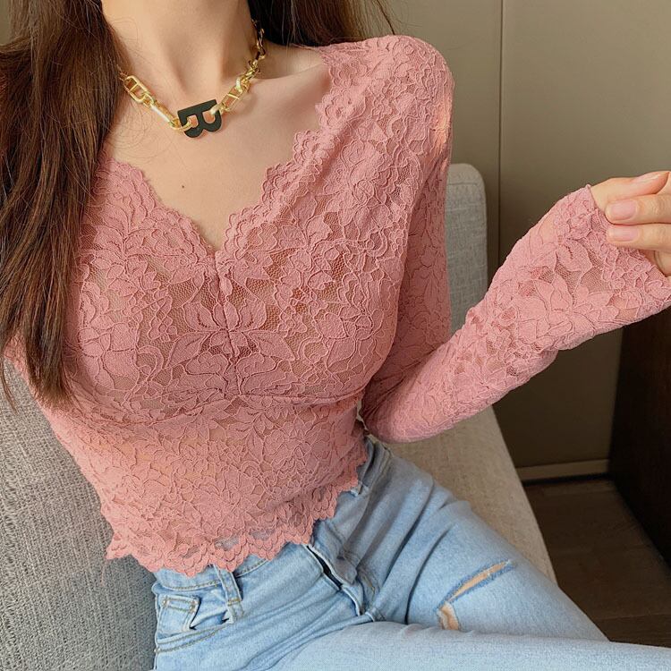 Vネックレースブラウス オータムシャツ ロング 秋物 ピュア ガールズファッション22058036710