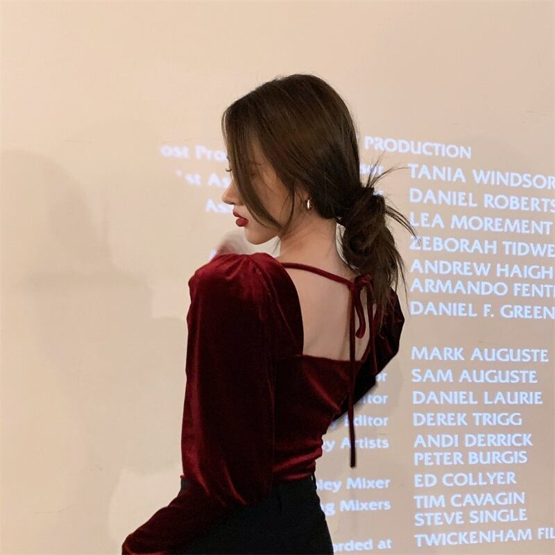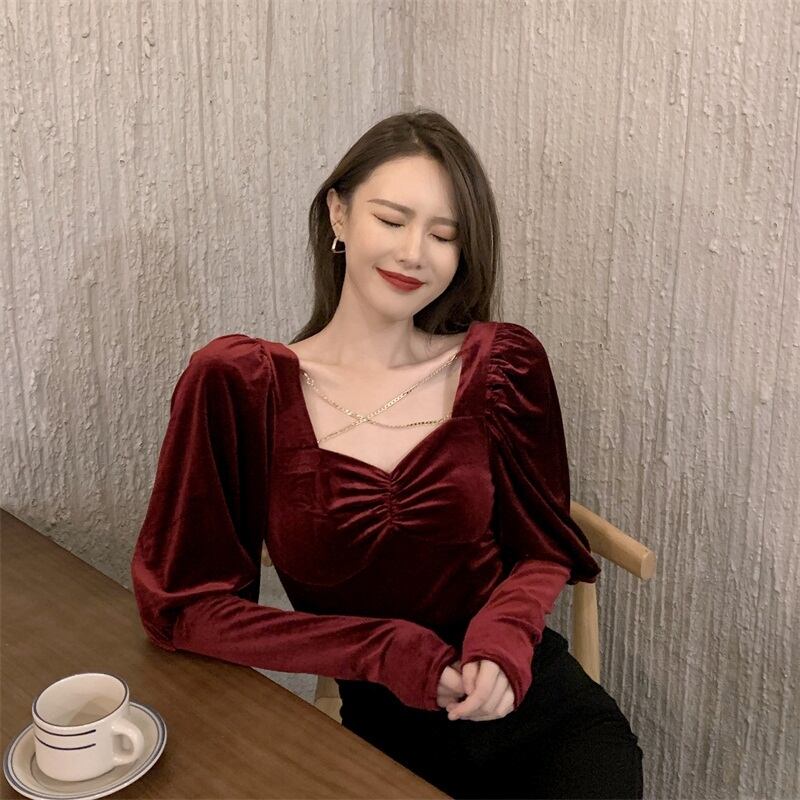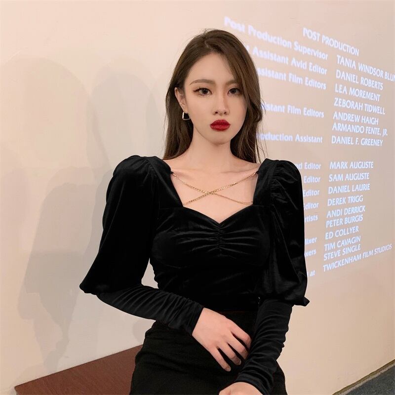 スタンダードカラースリーブベルベットシャツ オータムチェーン ショートトップス レトロ 秋物 スクウェア ガールズファッション14551022769