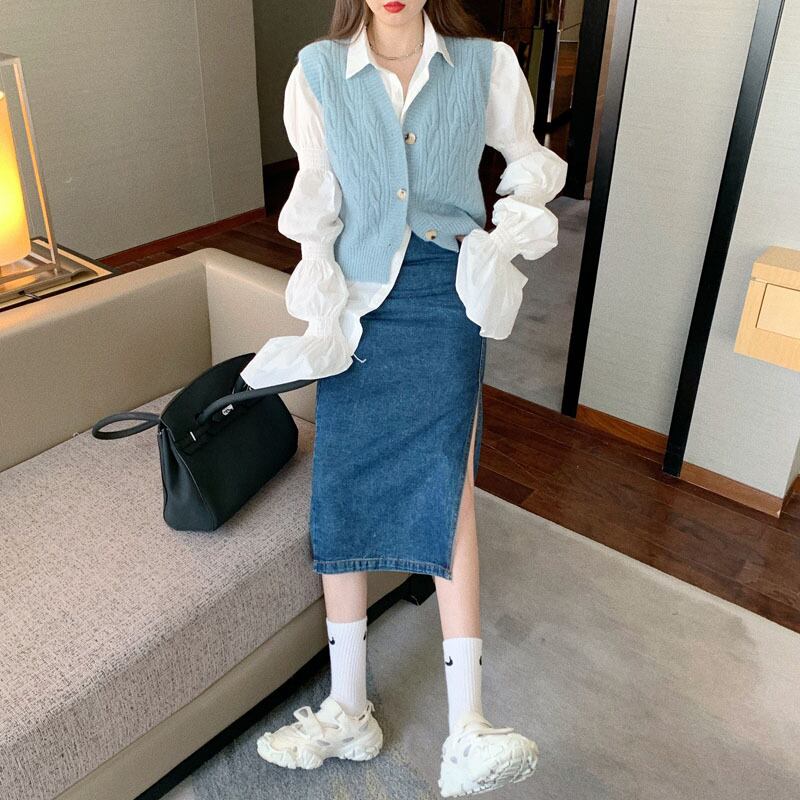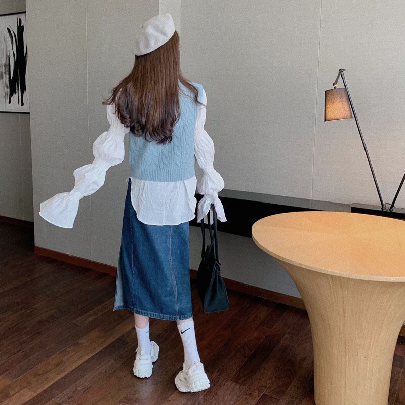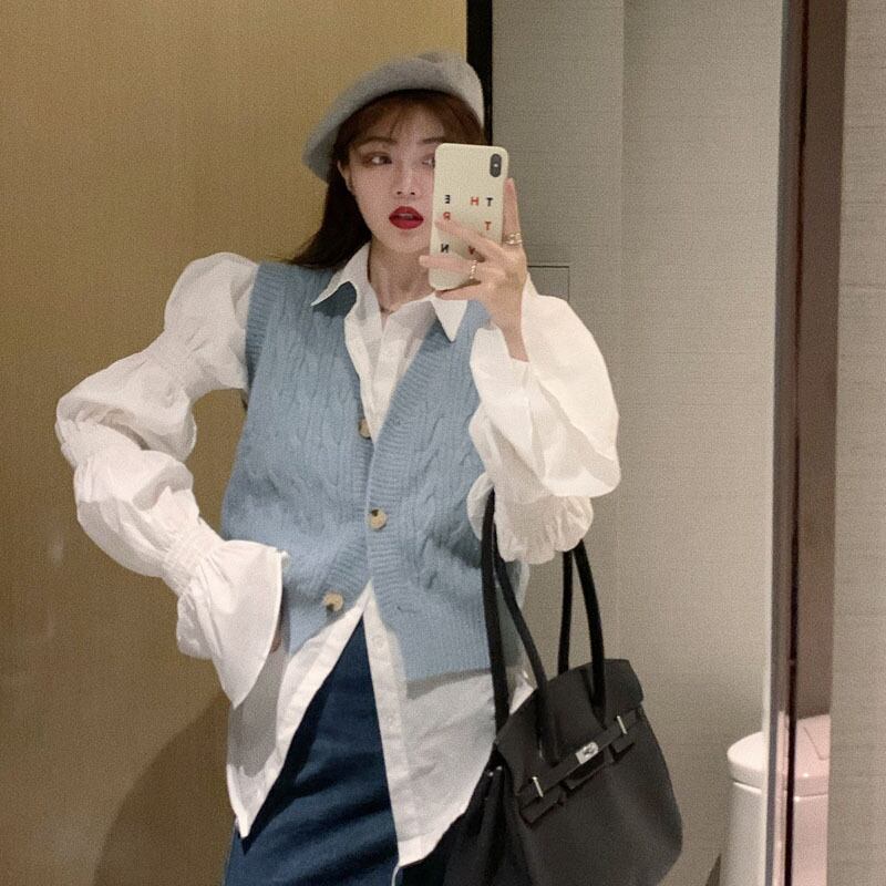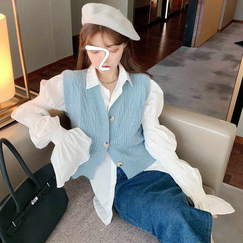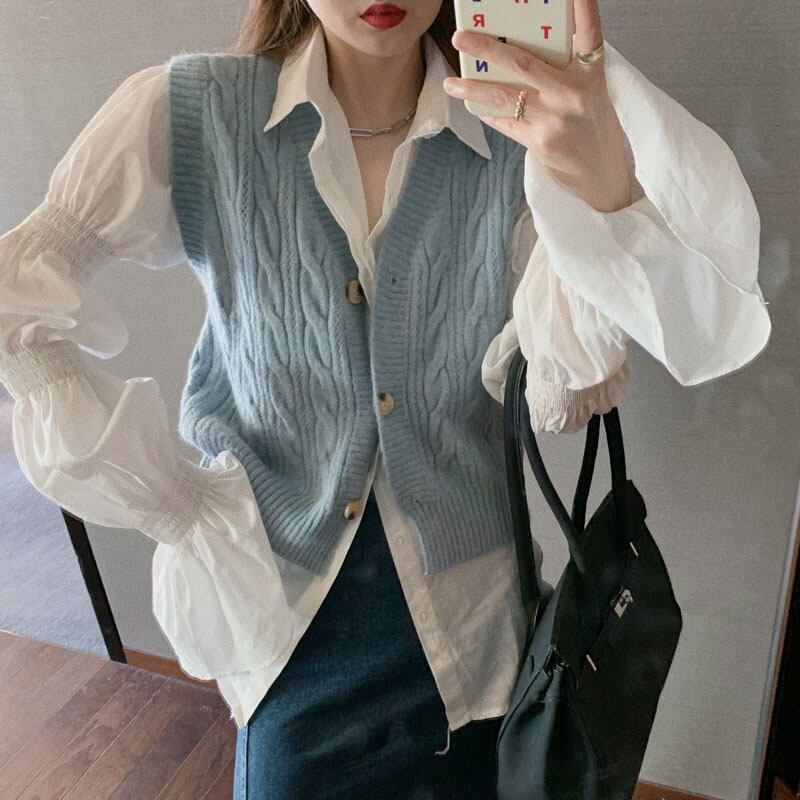 色:青いベスト,パフスリーブシャツ