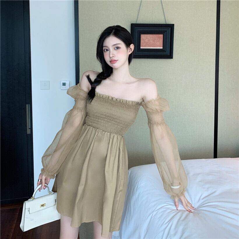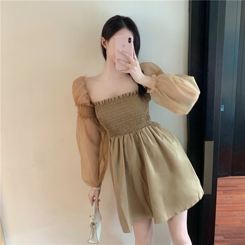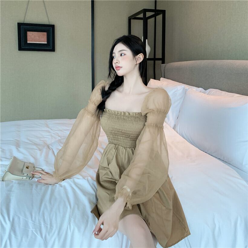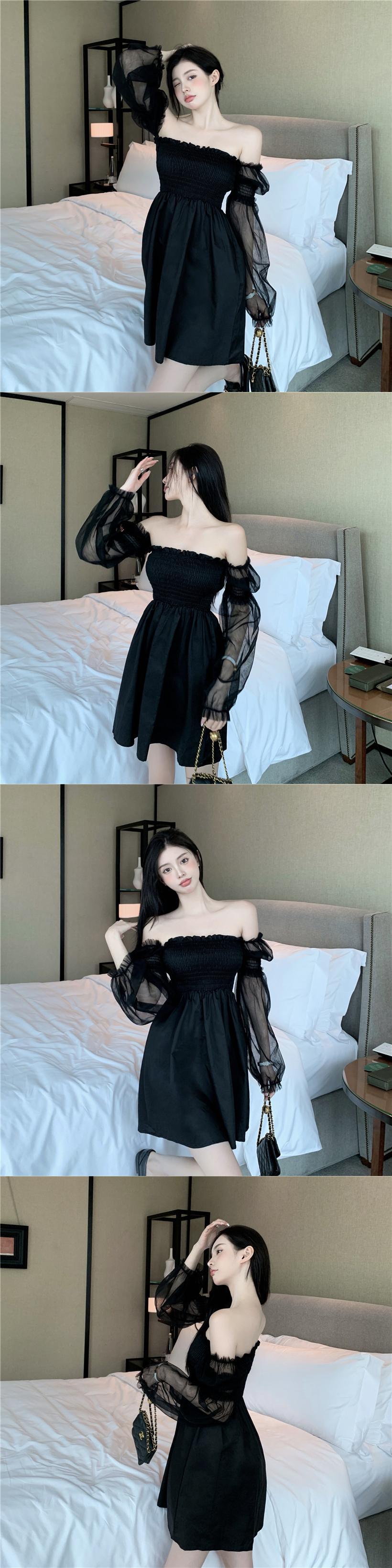 スタンダードスタイルカラーブラックドレス オータムウェストメッシュスリーブ レトロ 秋物 スクウェア ガールズファッション87090021698