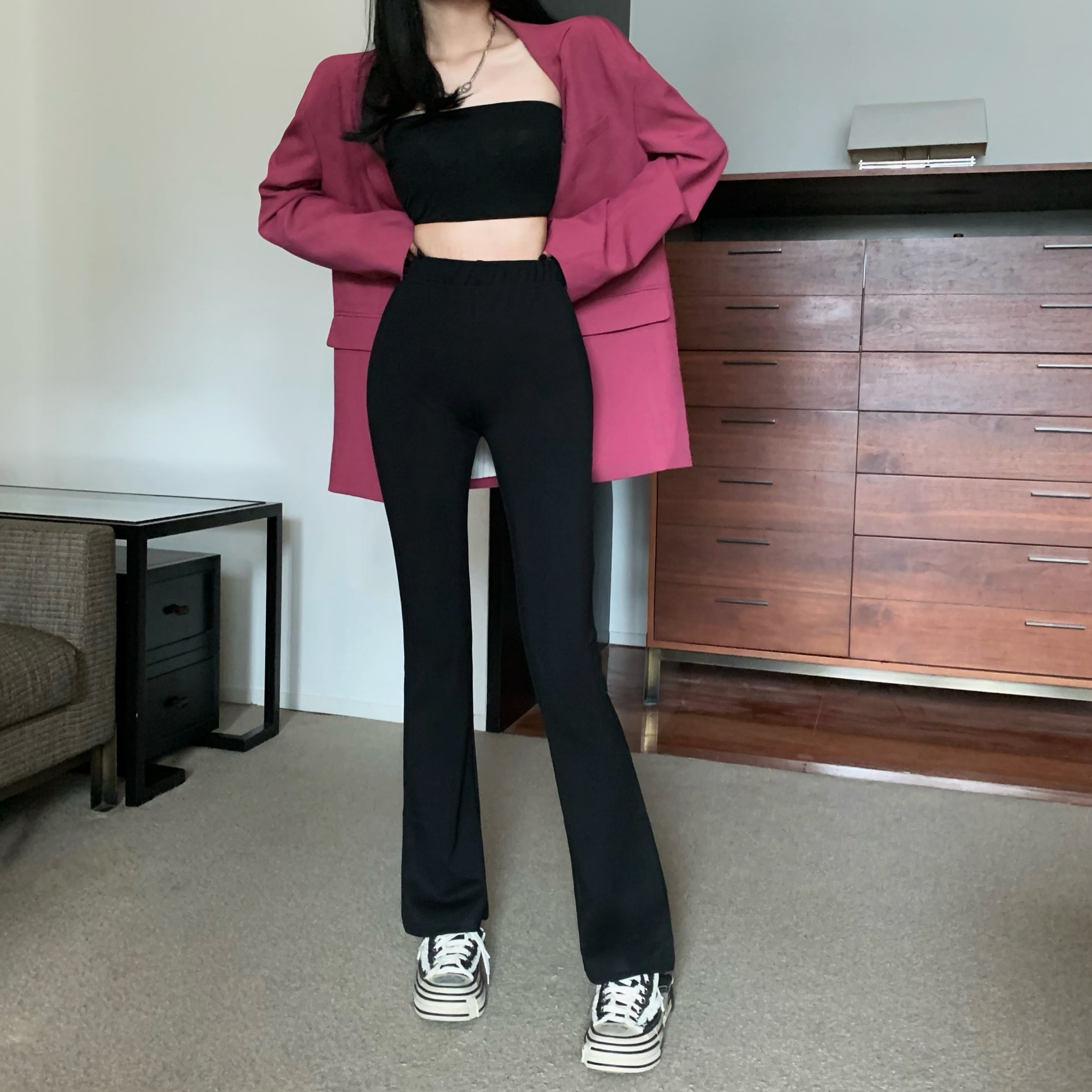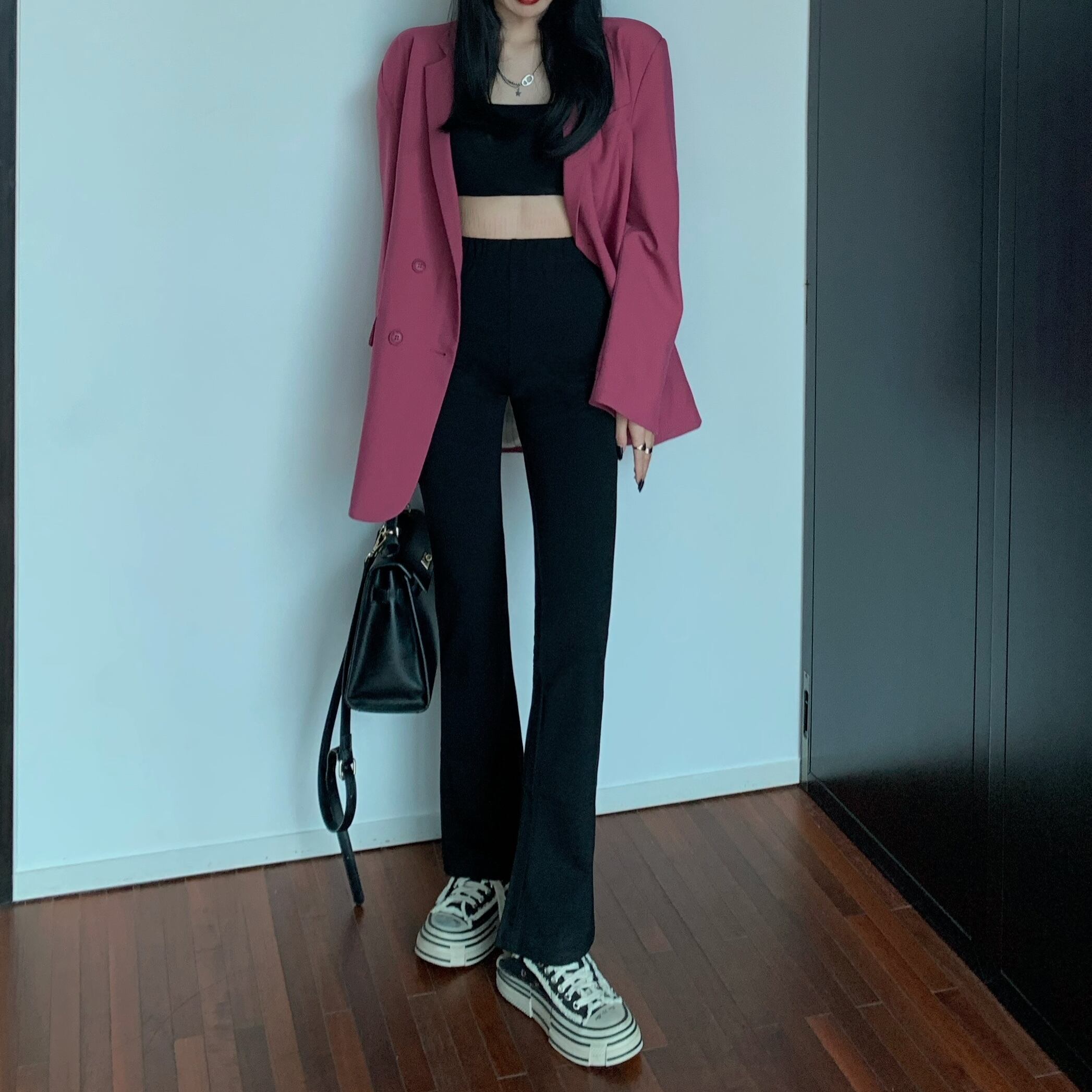 ブラックハイウェスト薄手パンツ オータムカジュアル ストリート 秋物 ガールズファッション34898117252