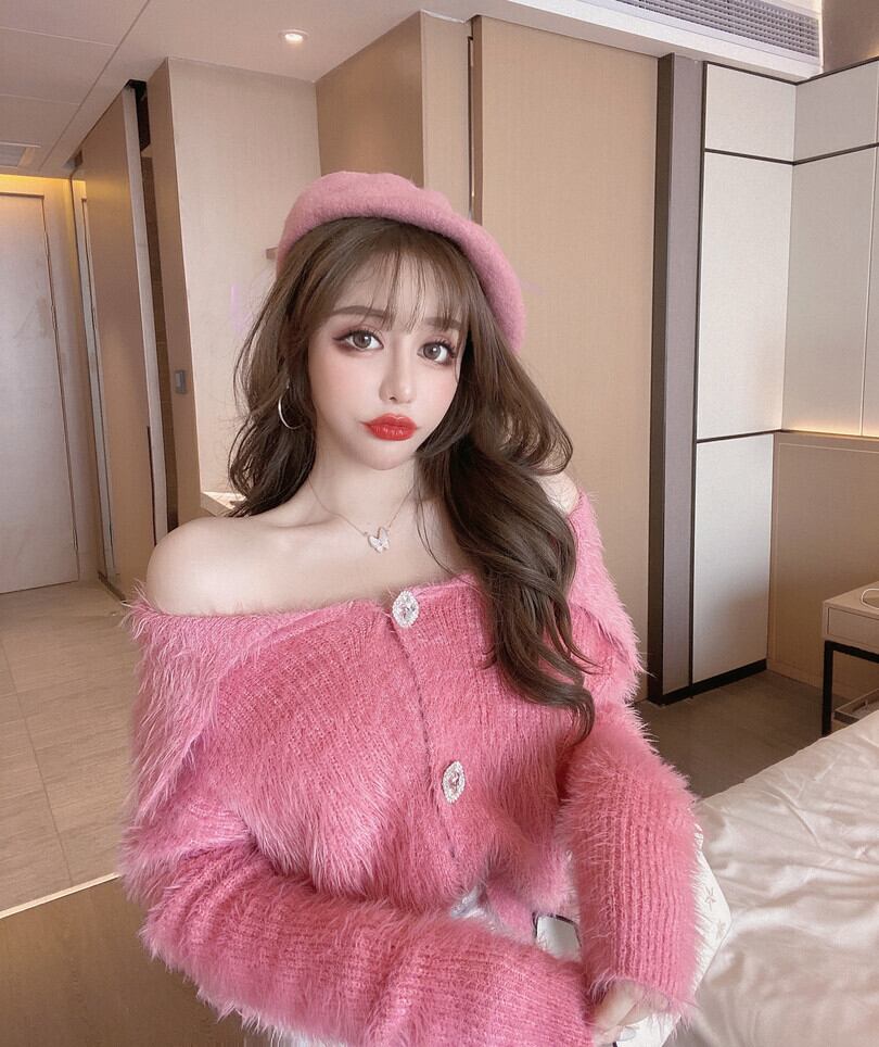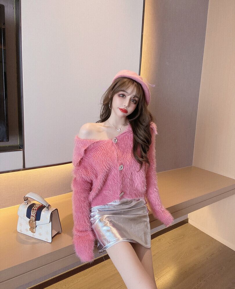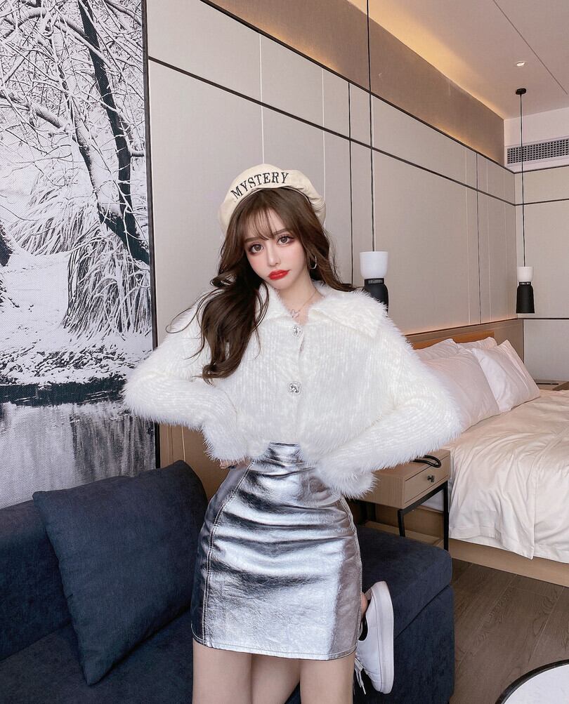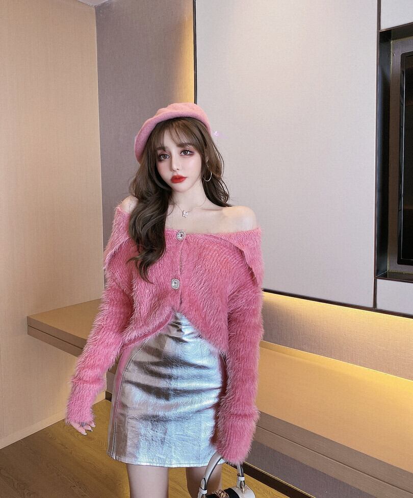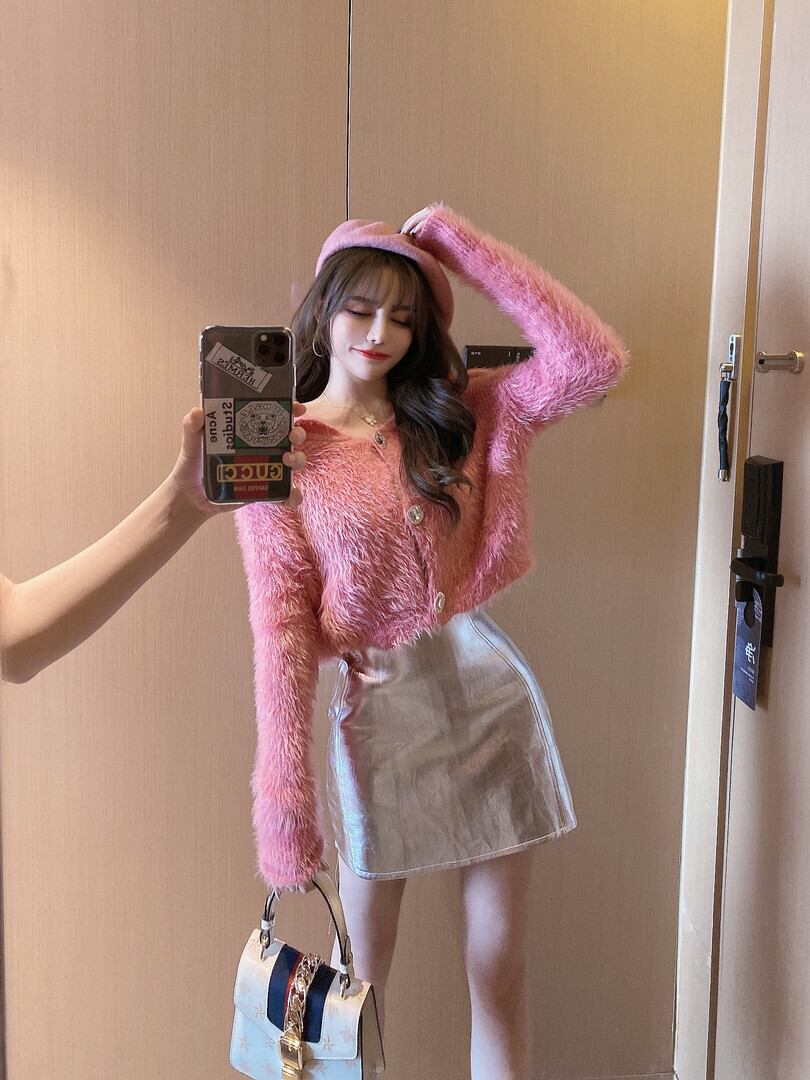 色:白いセーター,ピンクのセーター,シルバーバッグヒップスカート