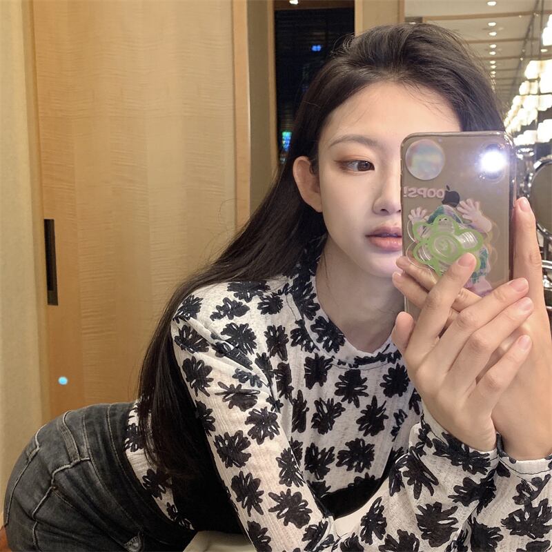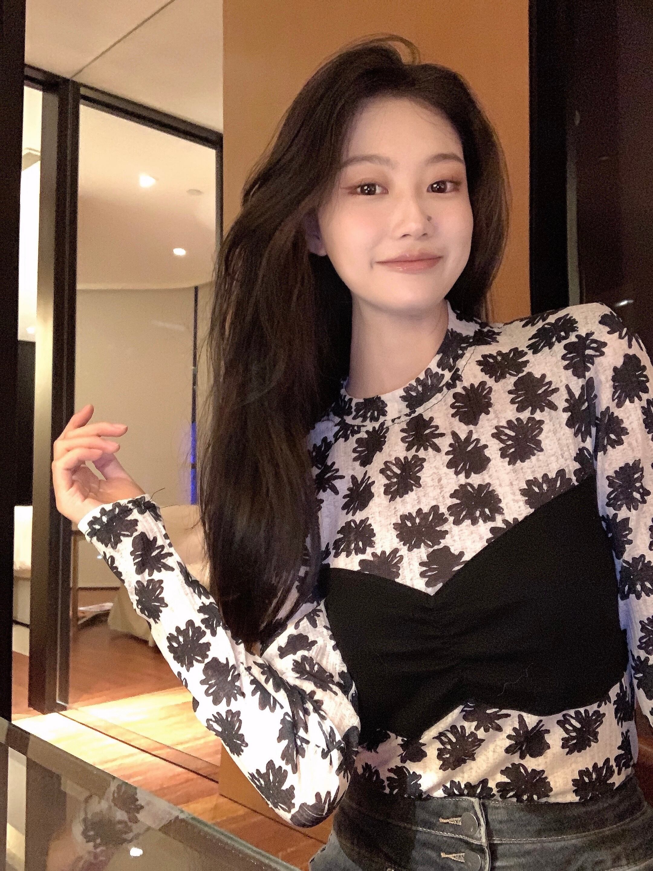 薄手トップス レディースオータムスリムフローラルTシャツ ロング 秋物 花柄 ステッチ ガールズファッション9969903284