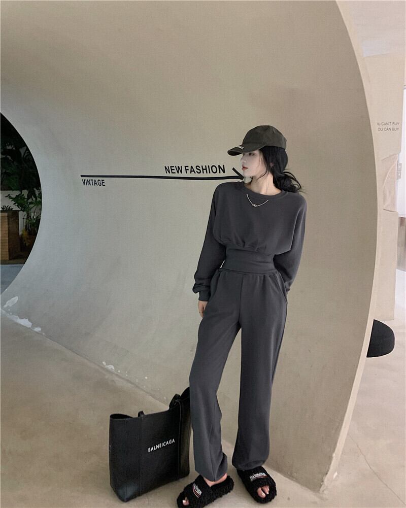 ウェストスリムショートグレーセーター レディースオータムラウンドネックカジュアルシャツ ロング 秋物 Oネック ガールズファッション7605207761
