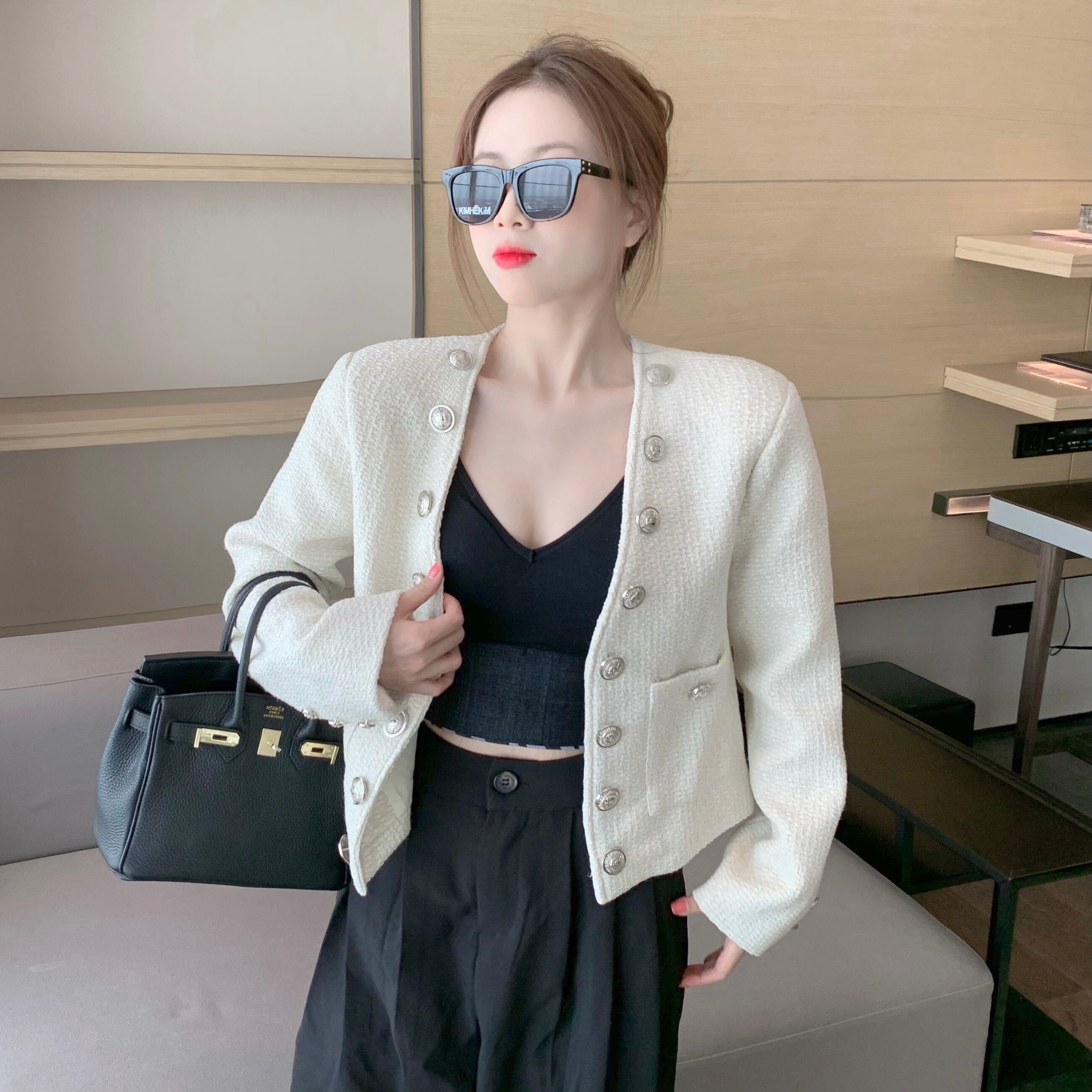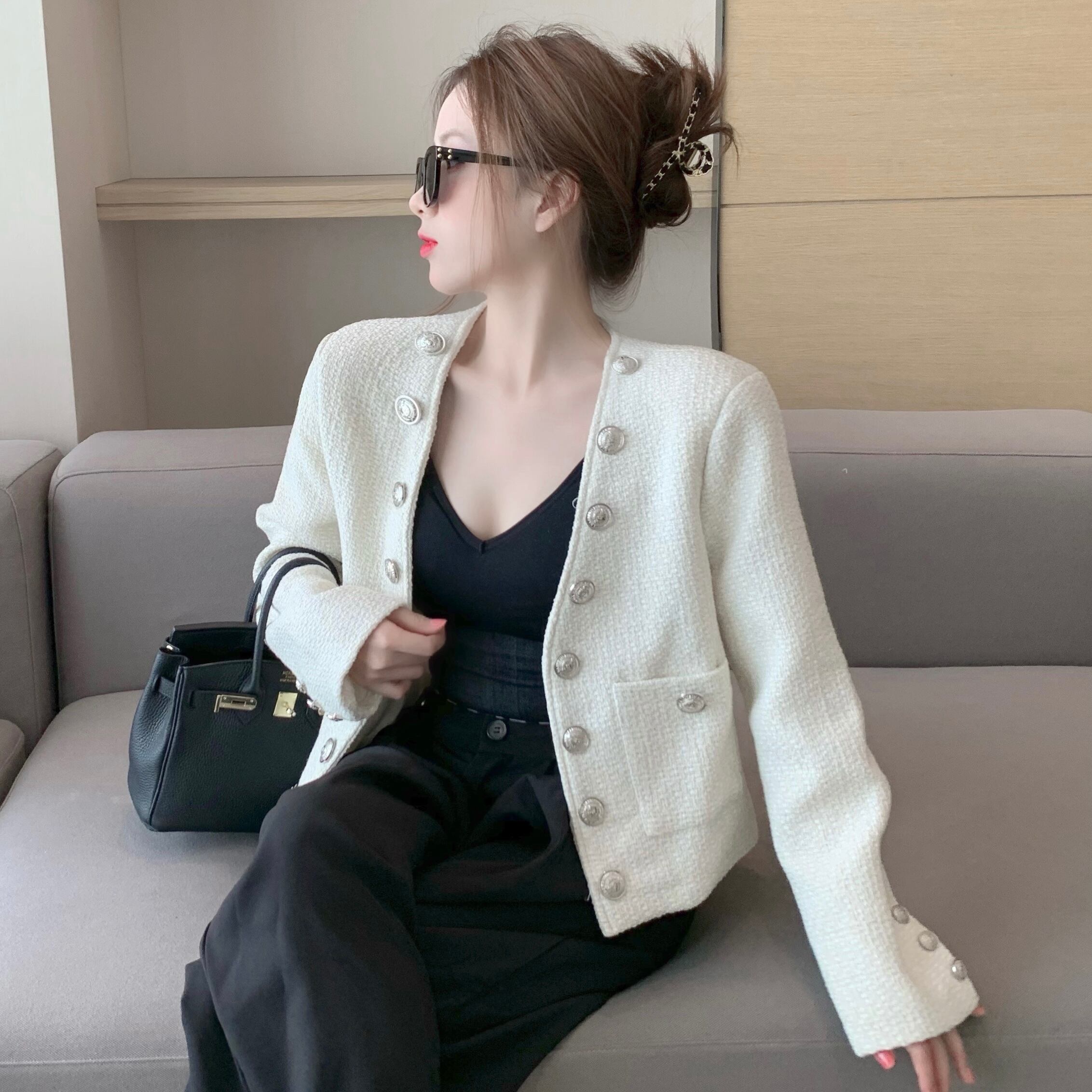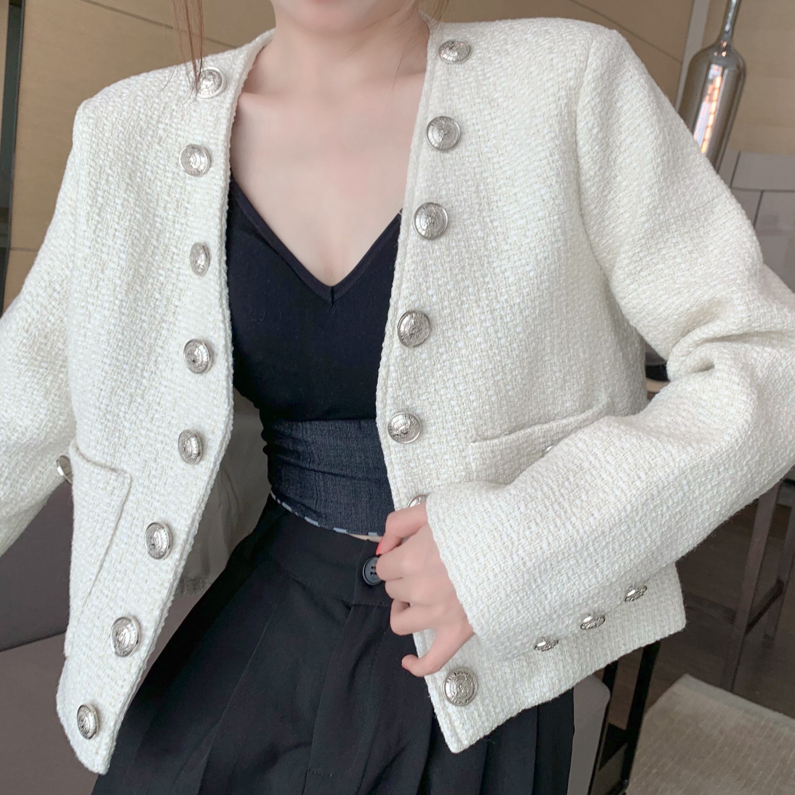 スタンダードツィードショートホワイトコート オータムダブルブレストトップス ロング レトロ 秋物 ガールズファッション71045047649