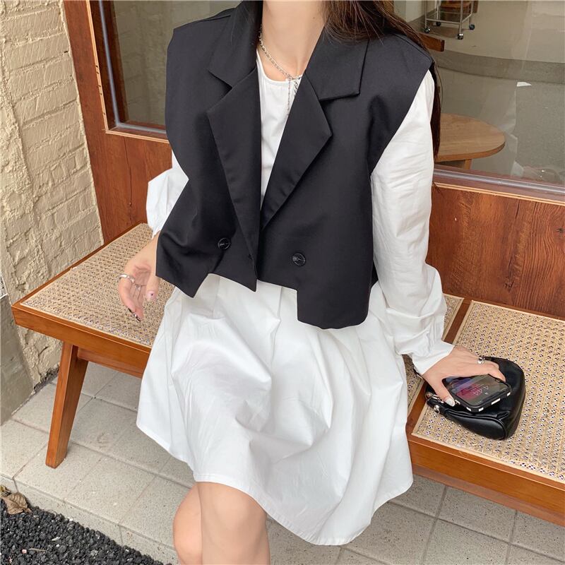 色:黒のベスト,ダークブラウンのベスト,白いドレス,アプリコットドレス