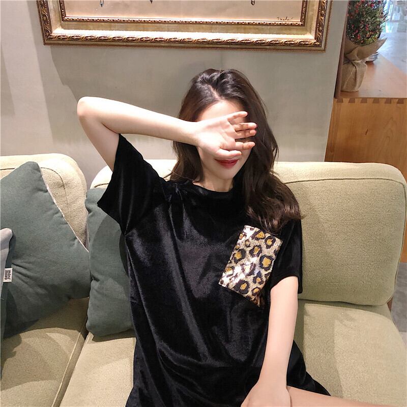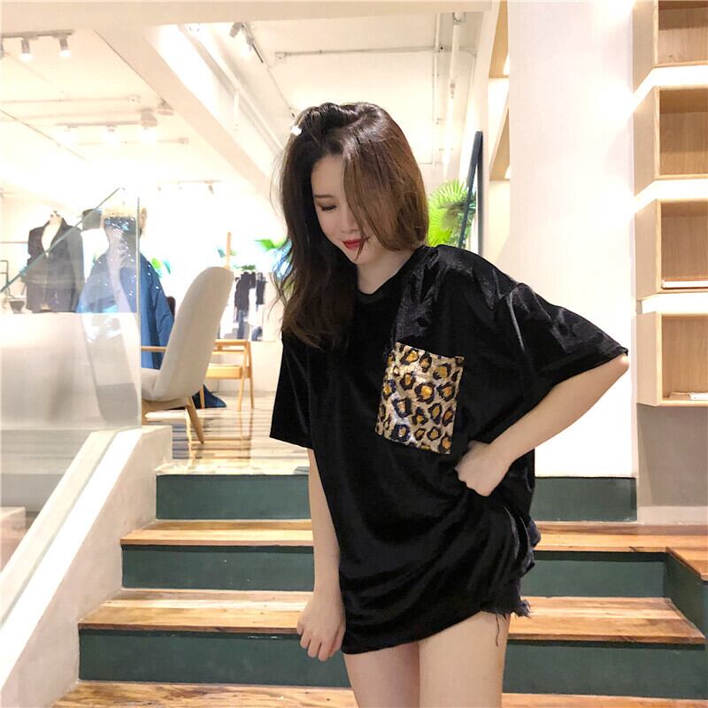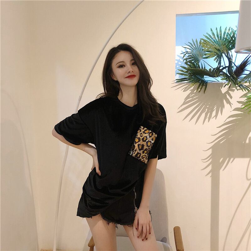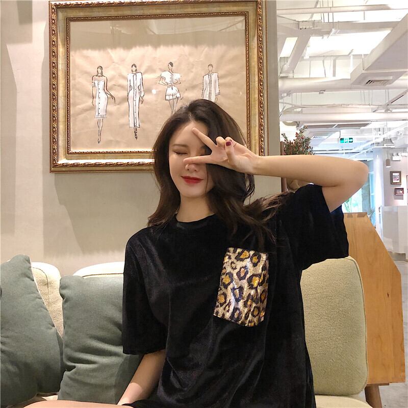 レオパードパターンベルベットルーズラウンドネックTシャツ オータムカジュアルトップス 秋物 Oネック ステッチ ガールズファッション62728962413