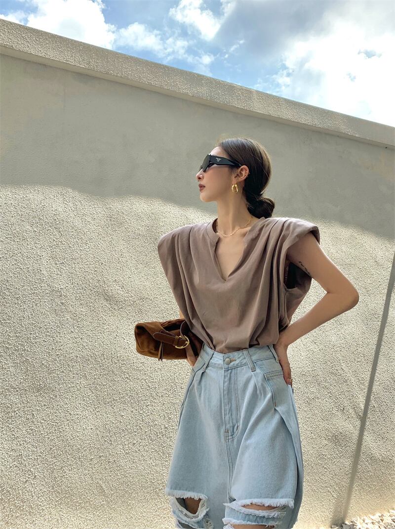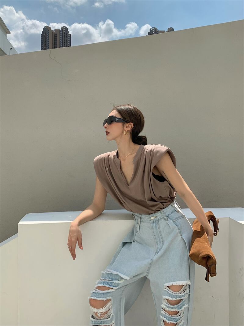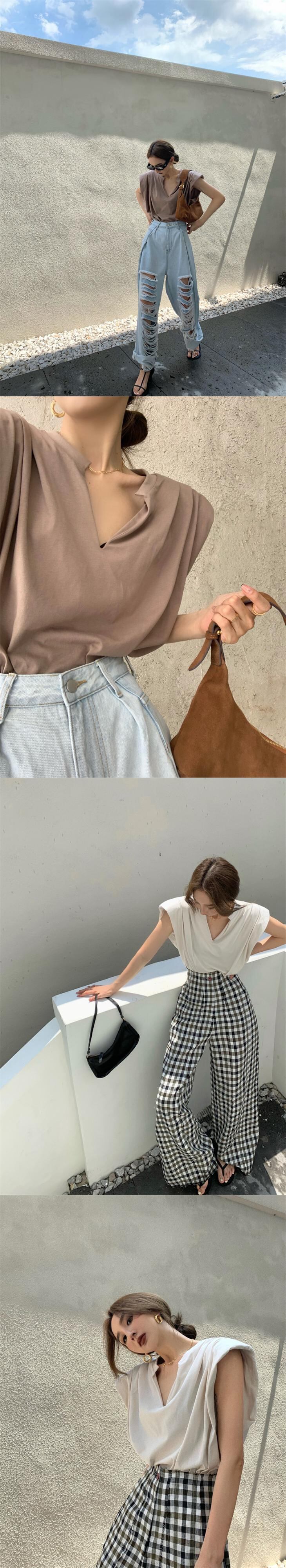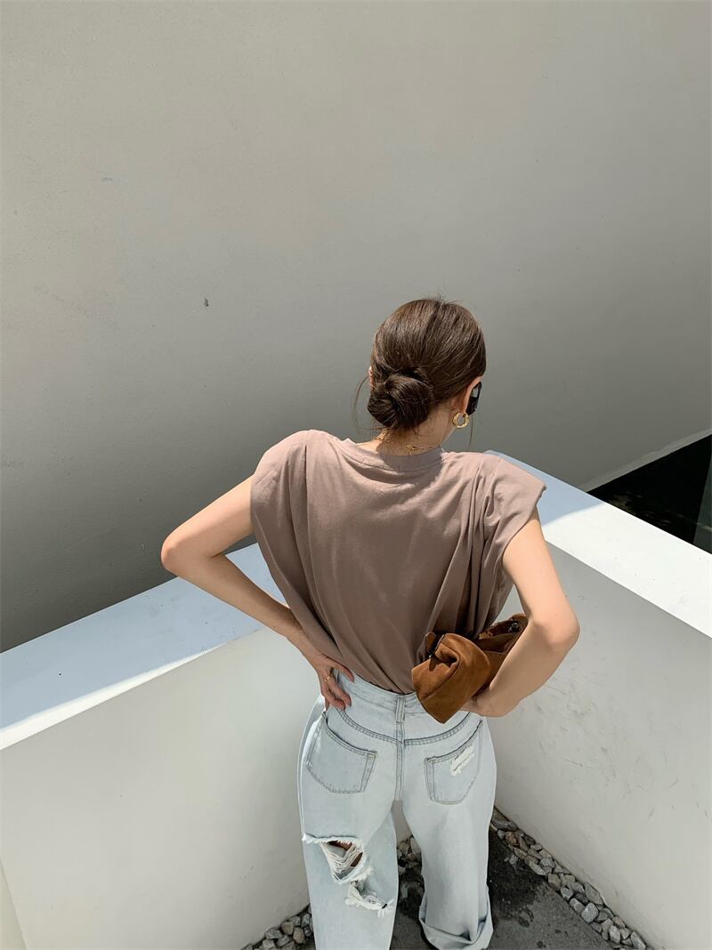 Tシャツ オータムVネックルーズスリーブソリッド カラーノースリーブトップス 秋物 ソリッドカラー ガールズファッション83777750633