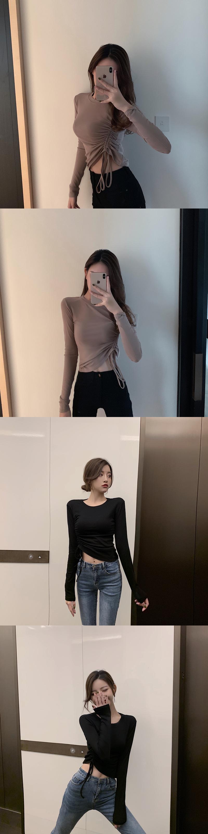 Tシャツ シャツ オータムスリムサイドギャザーラウンドネックトップス プルオーバー 秋物 Oネック ガールズファッション44676771772