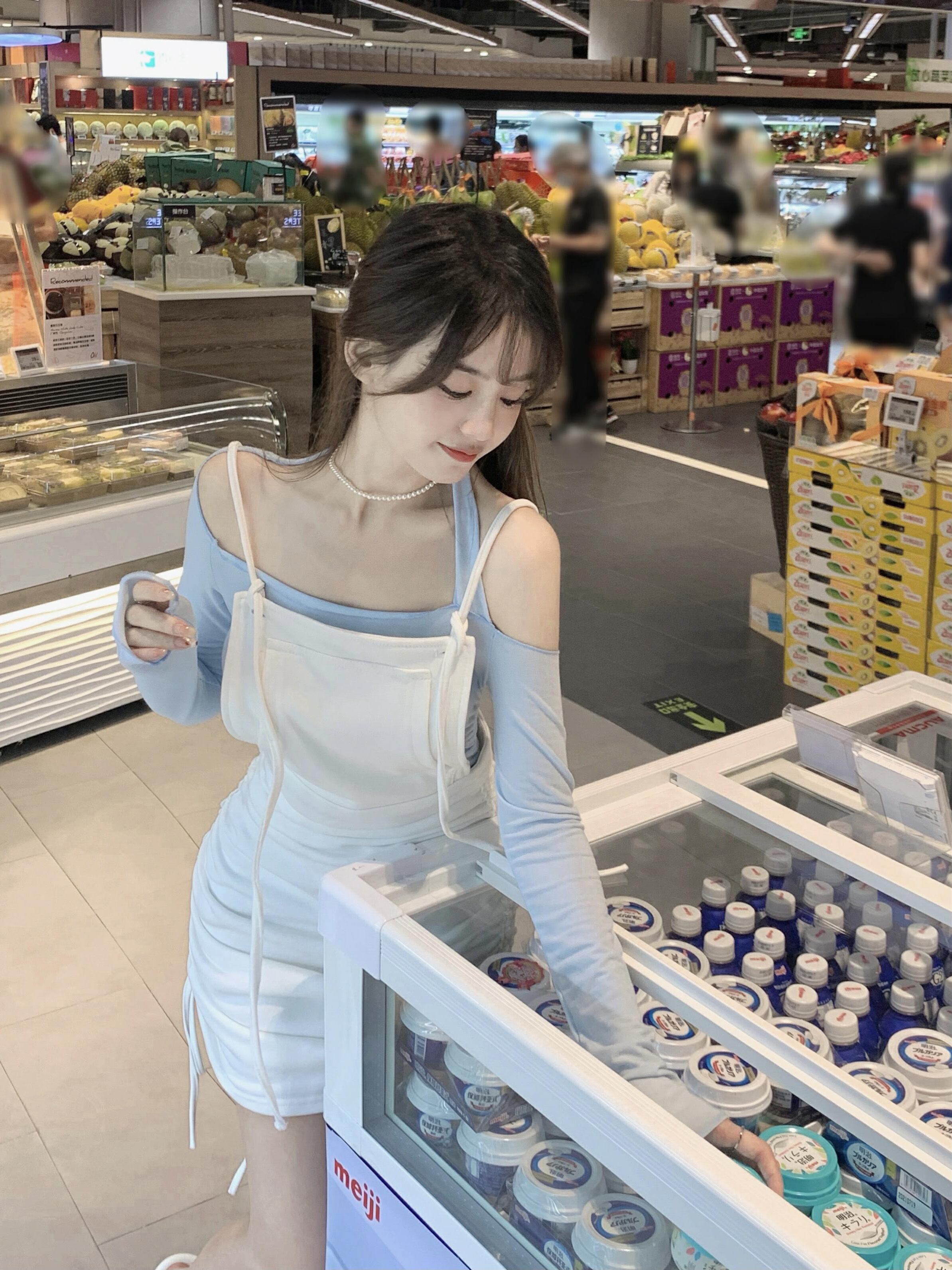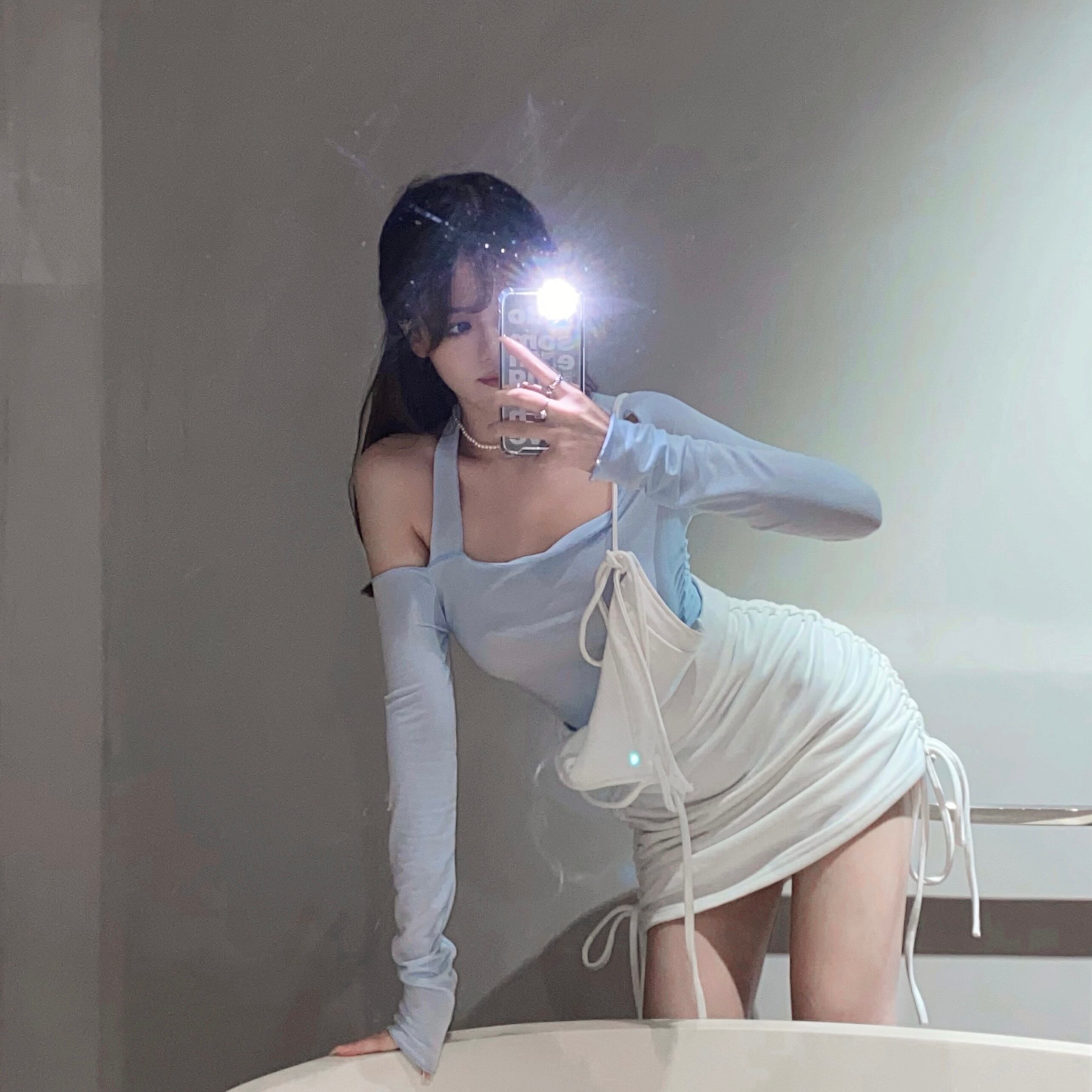 トップス オータムショートストラップレスホルターTシャツ シャツ 薄手ブルー ロング 秋物 ピュア ガールズファッション61901704889