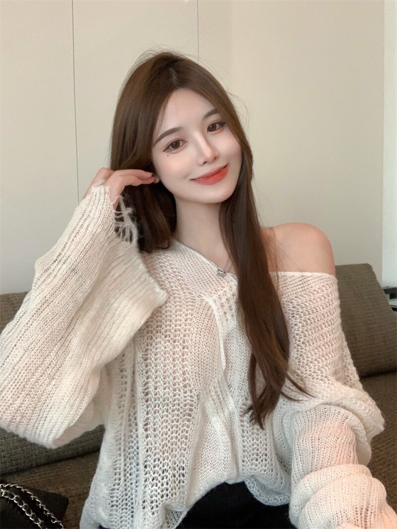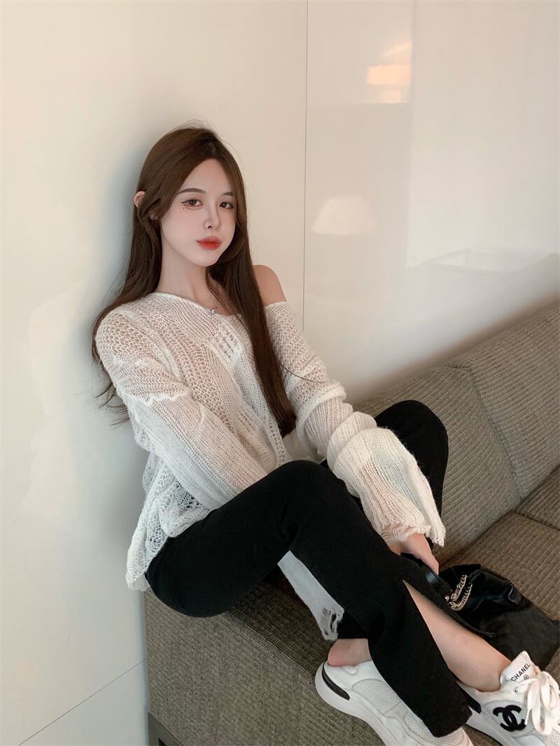 Vネック薄手セーター レディースオータムルーズカジュアルショートコート ブラウス ロング 秋物 ガールズファッション32475220098