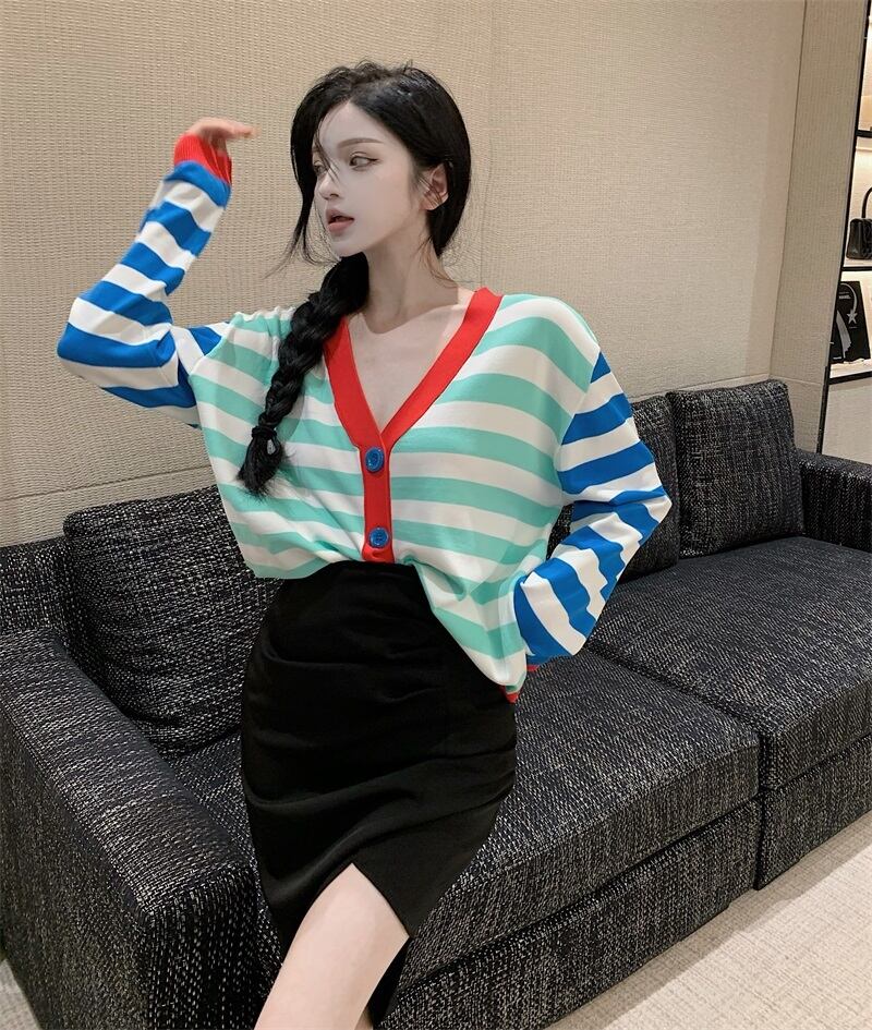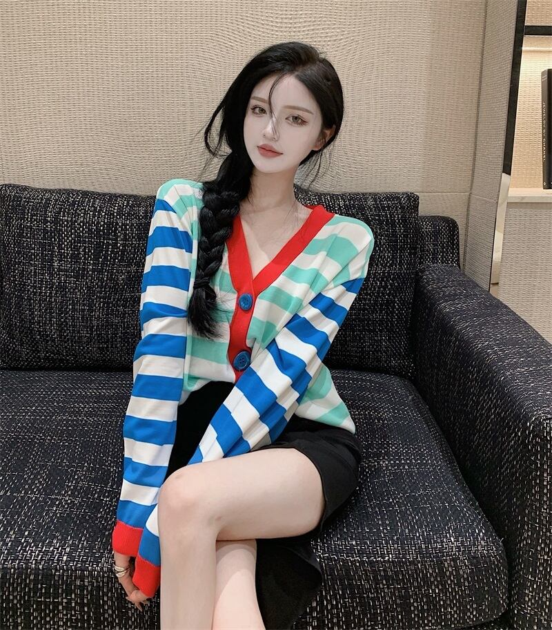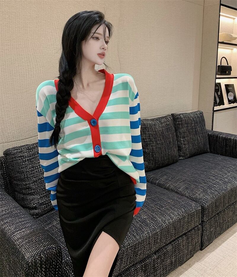オータムカラーストライプセーター Vネックスタンダードルーズブラウス カーディガン レトロ 大人ガーリー スウィート キュート カジュアル 秋物 ガールズファッション81673200572