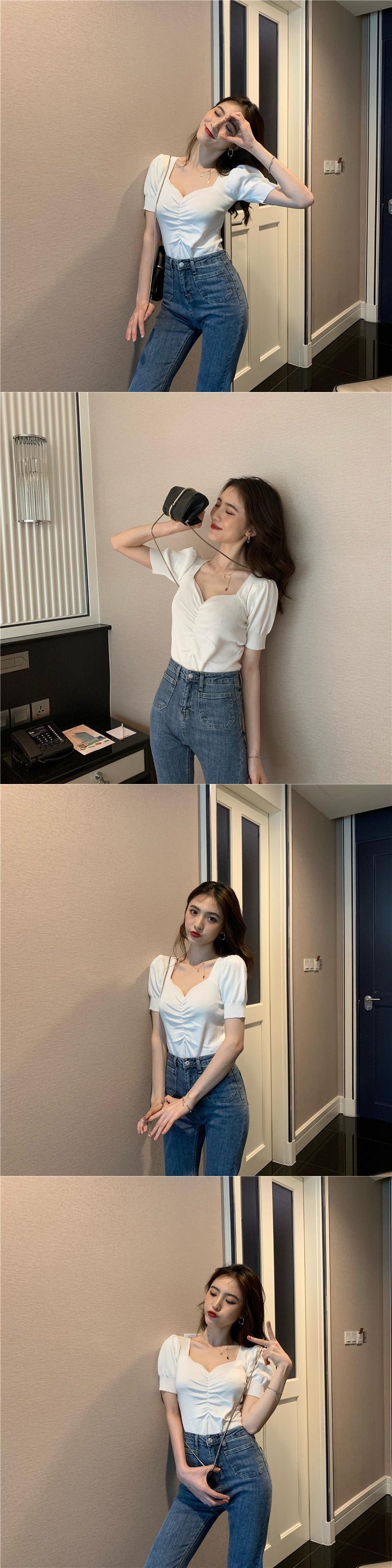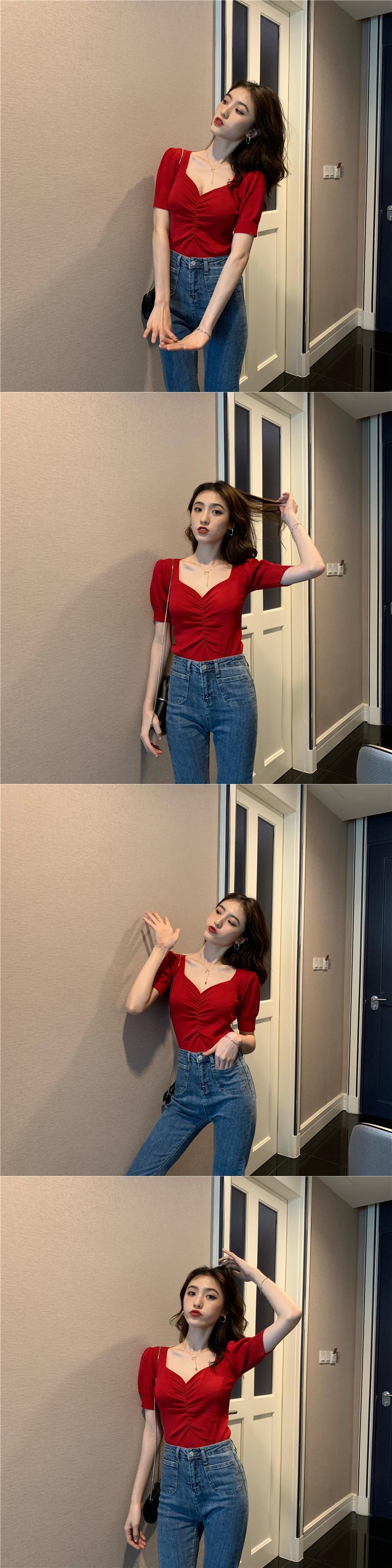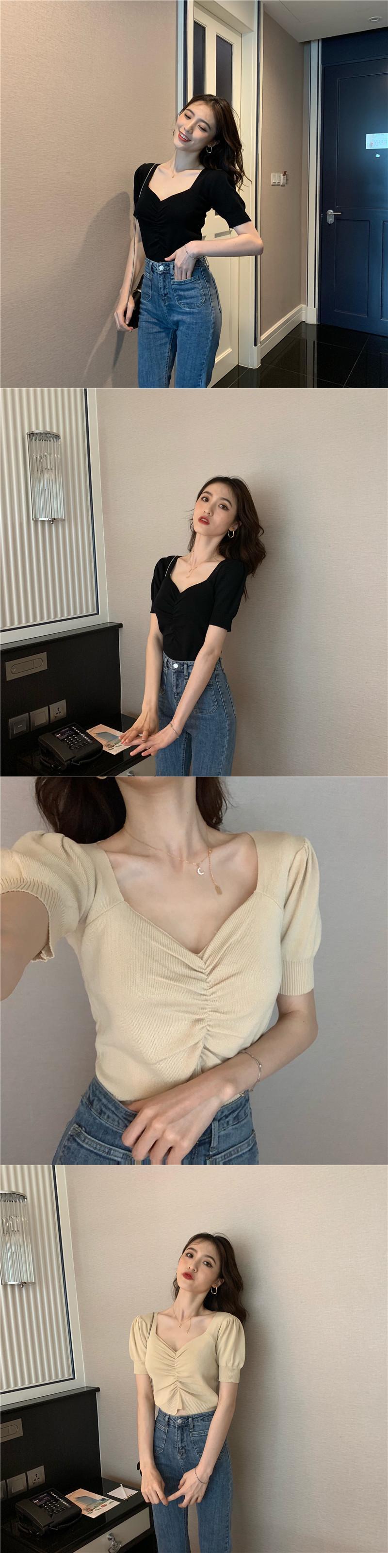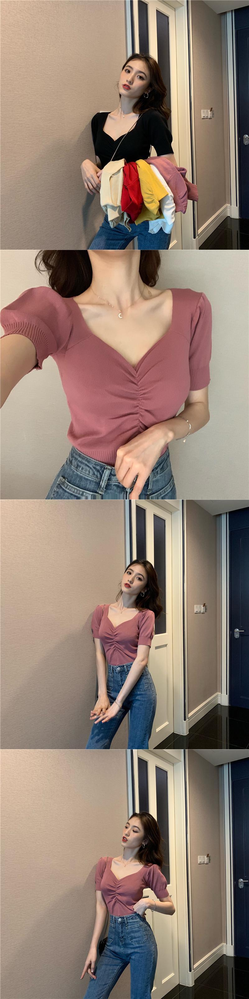 スタンダードVネックスリーブニットトップス サマースリムTシャツ レディース レトロ 夏物 ガールズファッション19028338134