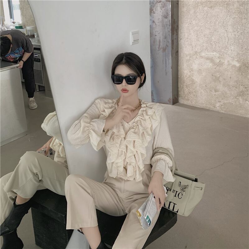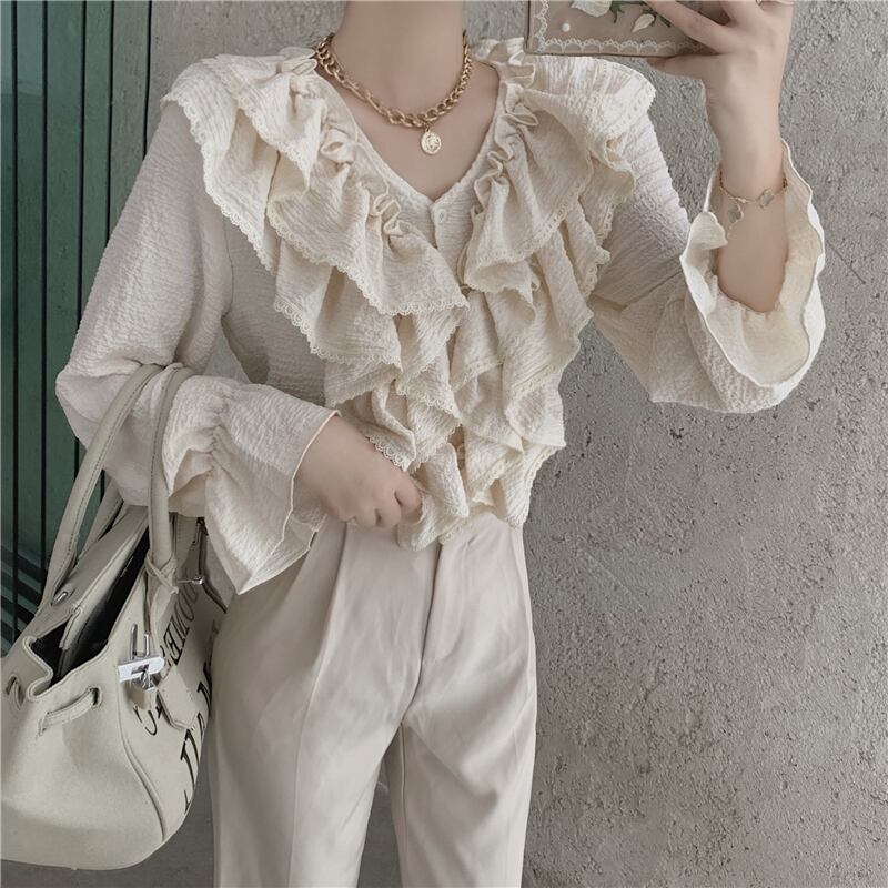 オータムスタンダードVネックブラウス スタイルシャツ ロング レトロ 秋物 ガールズファッション5044688340