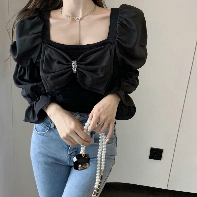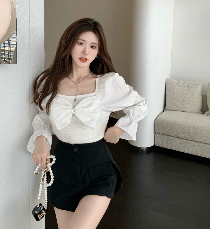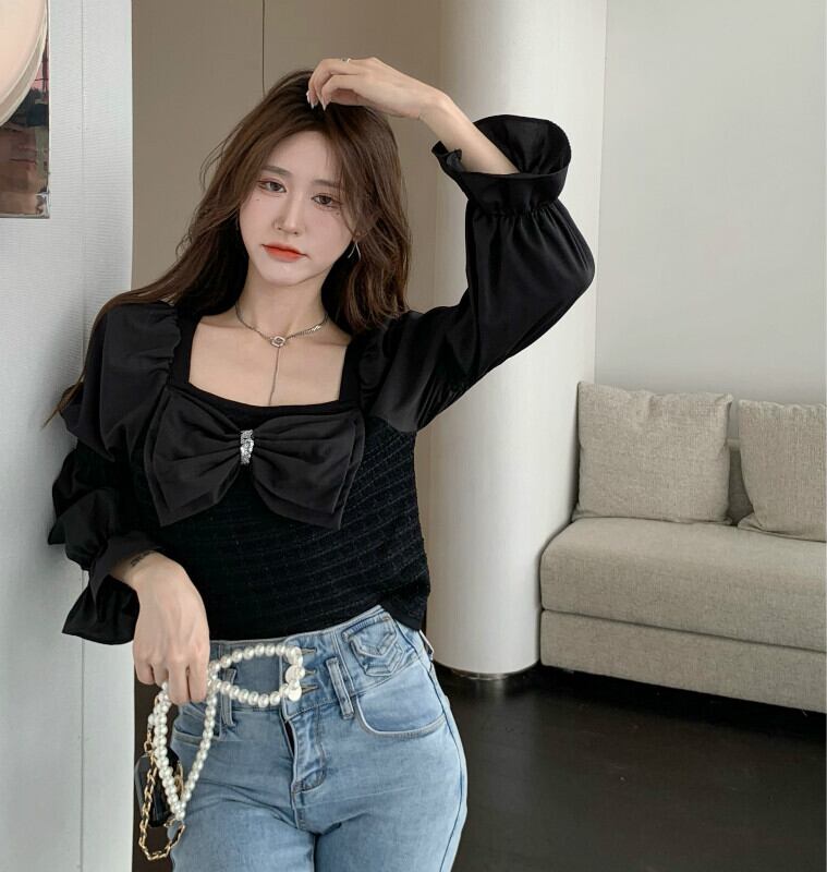 スタンダードカラースリムセーター オータムホワイトトップス ロング リボン レトロ 秋物 スクウェア ステッチ ガールズファッション22493596128