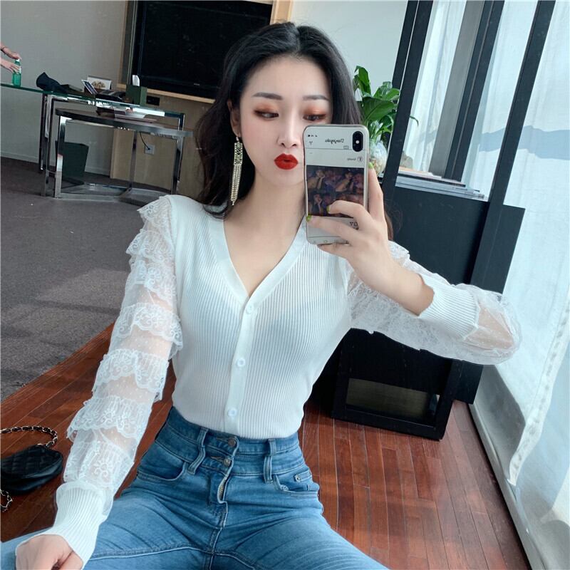 レースVネックブラウス オータムスタイルカーディガンホワイトセーター ロング 秋物 ステッチ ガールズファッション30989156662