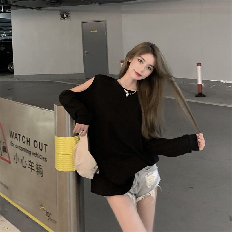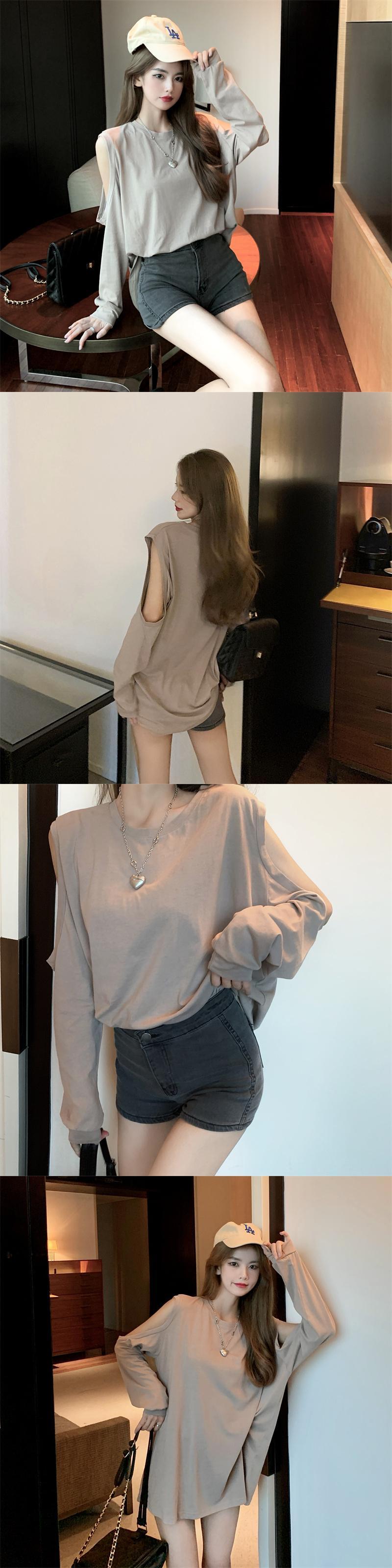 ストラップレスルーズブラウス オータムスタンダードラウンドネックプルオーバー 長袖スリーブTシャツ ロング レトロ 秋物 Oネック ガールズファッション632757058