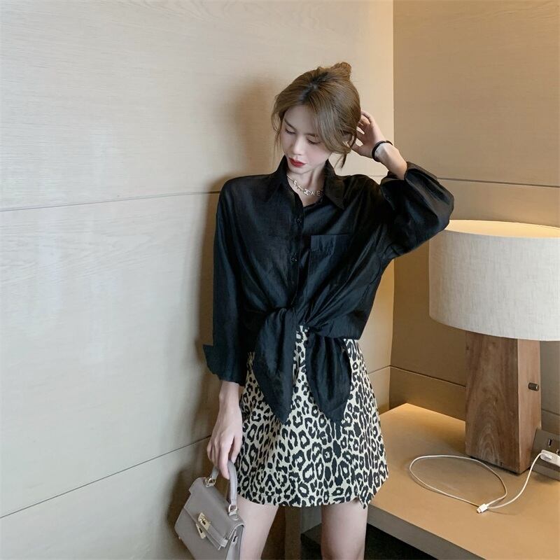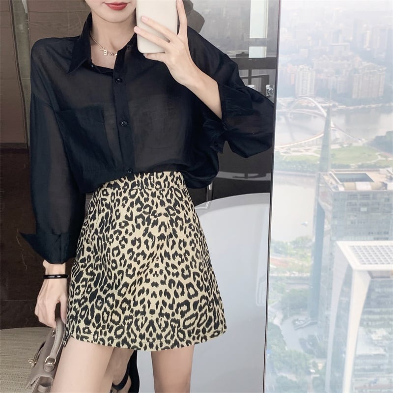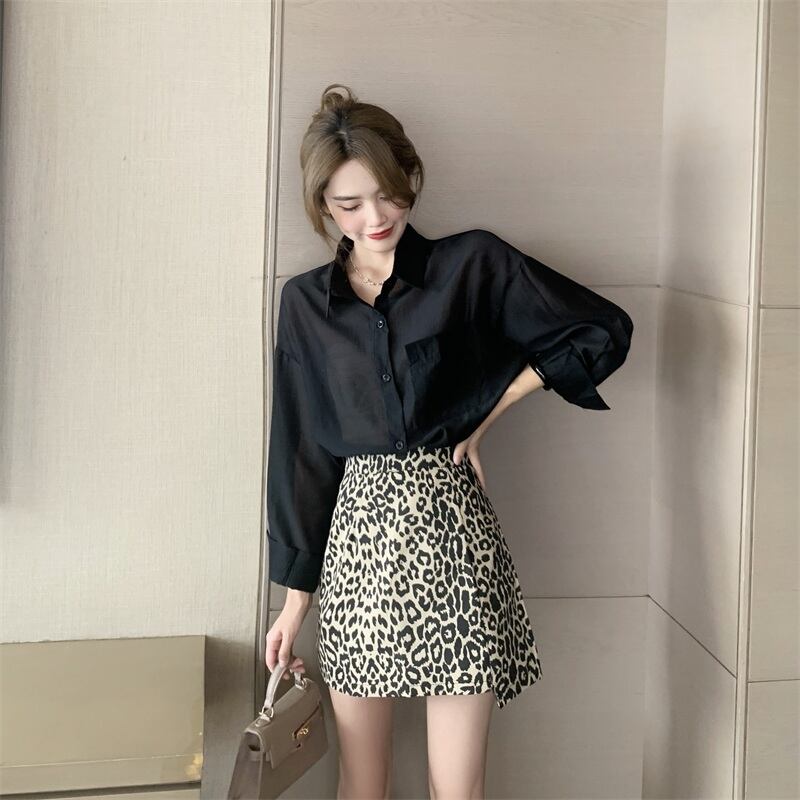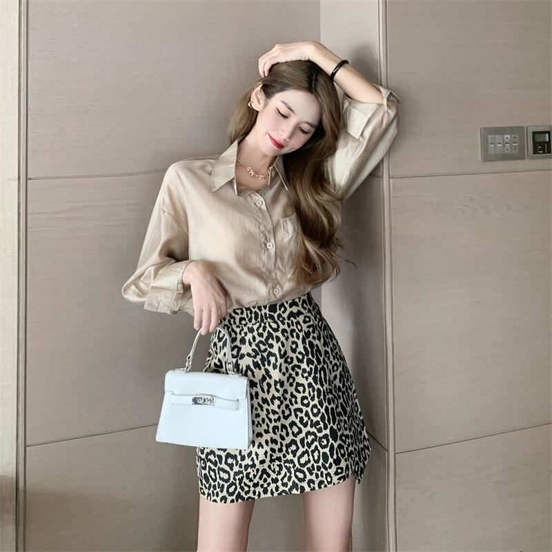 スタンダード薄手シャツ レオパードプリント柄ハイウェストウェストスカート オータムセット ロング レトロ ストリート 秋物 ガールズファッション78352913475