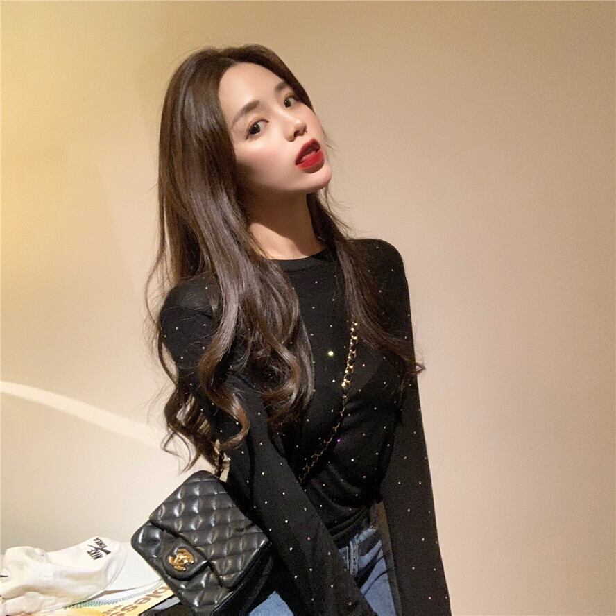 オータムスタイルブラックニットTシャツ レディーススタンダードスリムトップス レトロ 秋物 ガールズファッション17837107296