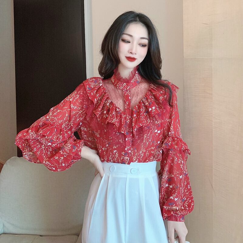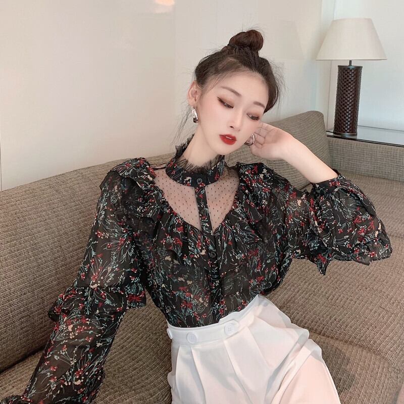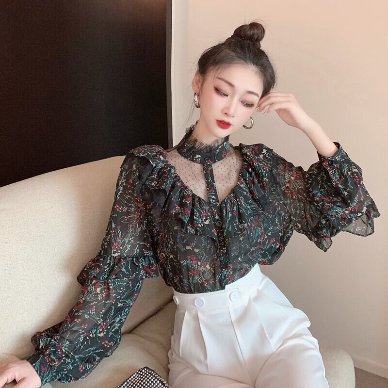 薄手カラーシフォンフローラルブラウス オータムメッシュルーズトップス ロング 秋物 花柄 ステッチ ガールズファッション91974560987