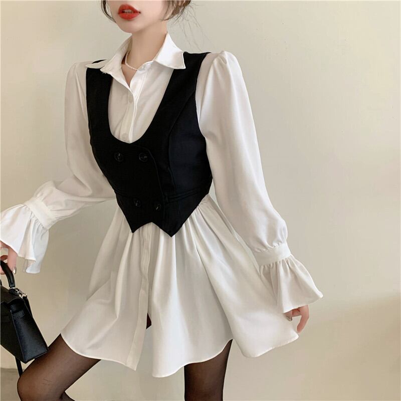 オータムスタンダードブラックレディースホワイトシャツ ドレス レトロ ストリート 大人ガーリー スウィート キュート カジュアル 秋物 ガールズファッション88117907282