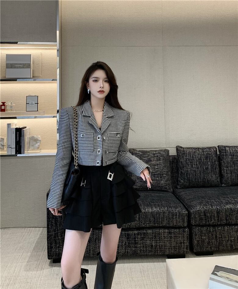 スタイルスタンダード格子柄カラーショートコート ジャケット オータムハイウェストショーツ ロング レトロ 秋物 ブルマー ガールズファッション18318830365