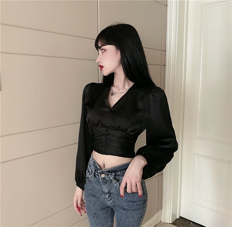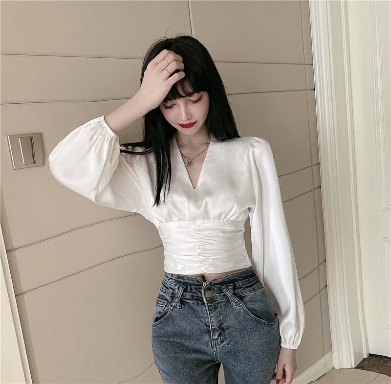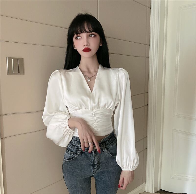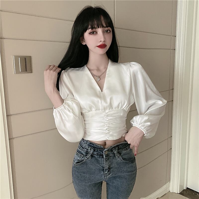 ホワイトオータムスリムショートサテン ブラウス 秋物 Vネック ガールズファッション40187165195