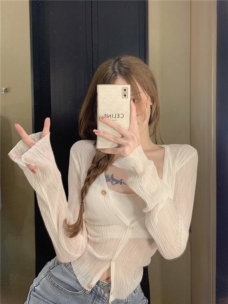 カーディガンジャケット 薄手ニットセーター オータムVネックショートトップス ロング 秋物 ピュア ガールズファッション57675973957
